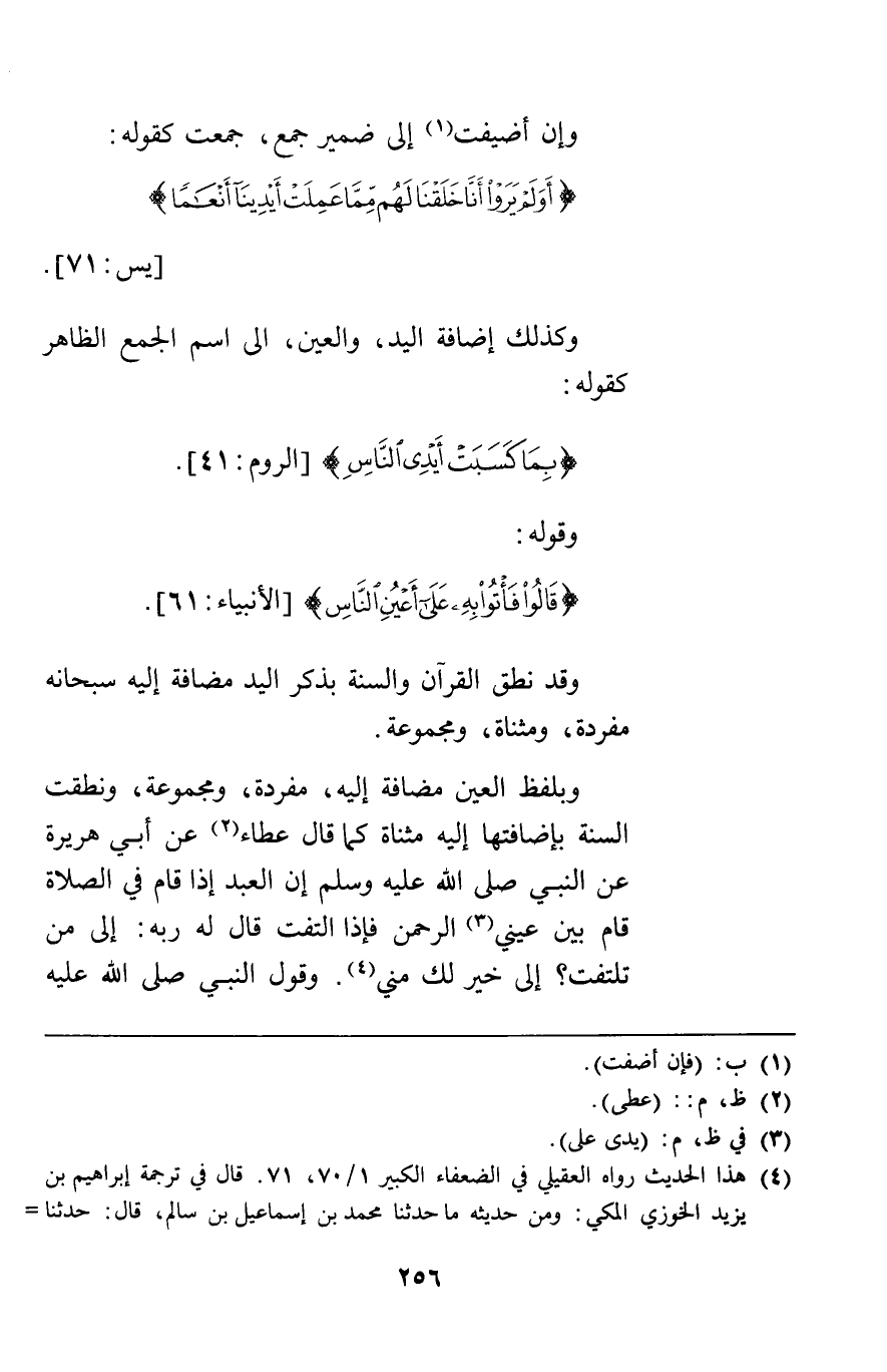 وإن أضيفت إلى ضمير جمع جمعت كقوله {أَوَلَمْ يَرَوْا أَنَّا خَلَقْنَا لَهُمْ مِمَّا عَمِلَتْ أَيْدِينَا أَنْعَاماً} [يس71] وكذلك إضافة اليد والعين إلى اسم الجمع الظاهر كقوله {بِمَا كَسَبَتْ أَيْدِي النَّاسِ} [الروم41] وقوله {قَالُوا فَأْتُوا بِهِ عَلَى أَعْيُنِ النَّاسِ} [الأنبياء61] وقد نطق القرآن والسنة بذكر اليد مضافة إليه سبحانه مفردة ومثناة ومجموعة. وبلفظ العين مضافة إليه مفردة ومجموعة ونطقت السنة بإضافتها إليه مثناة كما قال عطاء عن أبي هريرة عن النبي إن العبد إذا قام في الصلاة قام بين عيني الرحمن فإذا التفت قال له ربه إلى من تلتفت إلى خير لك مني وقول النبي صلى الله عليه