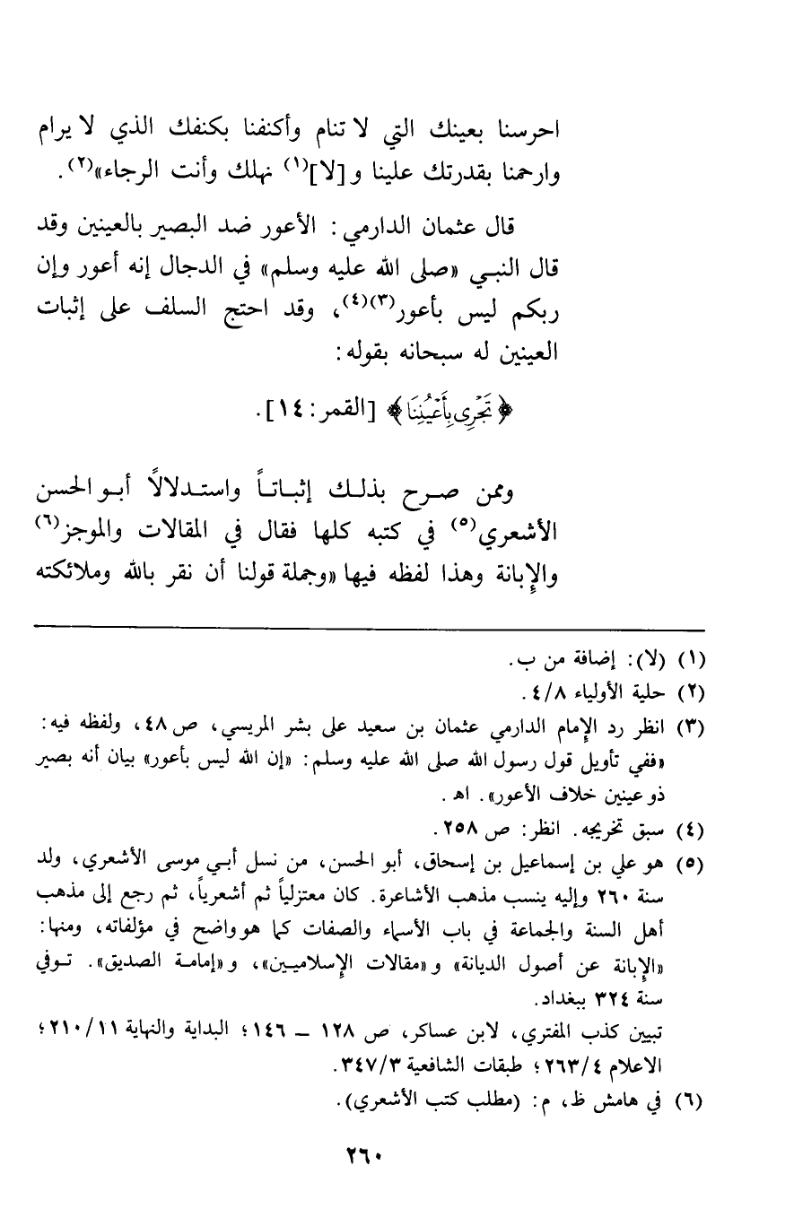 احرسنا بعينك التي لا تنام وأكنفنا بكنفك الذي لا يرام وارحمنا بقدرتك علينا ولا نهلك وأنت الرجاء. قال عثمان الدارمي الأعور ضد البصير بالعينين وقد قال النبي في الدجال "إنه أعور وإن ربكم ليس بأعور" وقد احتج السلف على إثبات العينين له سبحانه بقوله {تَجْرِي بِأَعْيُنِنَا} [القمر14] وممن صرح بذلك إثباتا واستدلالا أبو الحسن الأشعري في كتبه كلها فقال في المقالات والموجز والإبانة وهذا لفظه فيها وجملة قولنا أن نقر بالله وملائكته