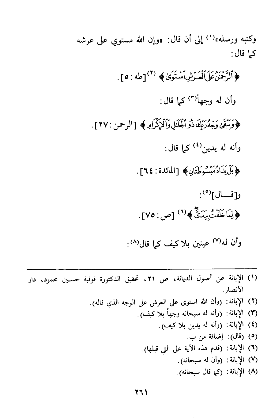 وكتبه ورسله إلى أن قال وإن الله مستوي على عرشه كما قال {الرَّحْمَنُ عَلَى الْعَرْشِ اسْتَوَى} [طه5] وأن له وجها كما قال {وَيَبْقَى وَجْهُ رَبِّكَ ذُو الْجَلالِ وَالأِكْرَامِ} [الرحمن27] وأن له يدين كما قال {بَلْ يَدَاهُ مَبْسُوطَتَانِ} [المائدة64] وقال {لِمَا خَلَقْتُ بِيَدَيّ} [ص75] وأن له عينين بلا كيف كما قال: