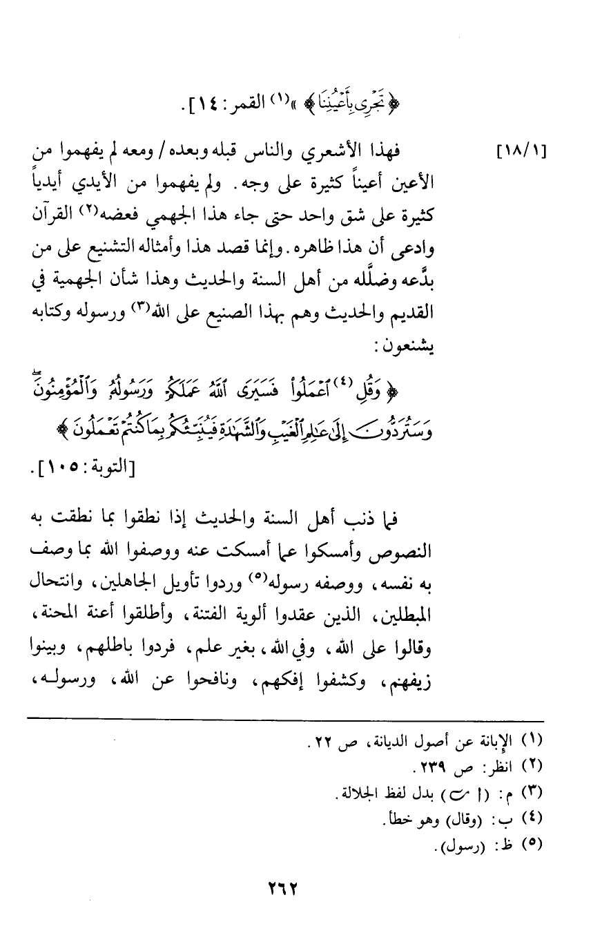 {تَجْرِي بِأَعْيُنِنَا} [القمر14] فهذا الأشعري والناس قبله وبعده ومعه لم يفهموا من الأعين أعينا كثيرة على وجه ولم يفهموا من الأيدي أيديا كثيرة على شق واحد حتى جاء هذا الجهمي فعضه القرآن وادعى أن هذا ظاهره وإنما قصد هذا وأمثاله التشنيع على من بدعه وضلله من أهل السنة والحديث وهذا شأن الجهمية في القديم والحديث وهم بهذا الصنيع على الله ورسوله وكتابه يشنعون {وَقُلِ اعْمَلُوا فَسَيَرَى اللَّهُ عَمَلَكُمْ وَرَسُولُهُ وَالْمُؤْمِنُونَ وَسَتُرَدُّونَ إِلَى عَالِمِ الْغَيْبِ وَالشَّهَادَةِ فَيُنَبِّئُكُمْ بِمَا كُنْتُمْ تَعْمَلُونَ} [التوبة105] فما ذنب أهل السنة والحديث إذا نطقوا بما نطقت به النصوص وأمسكوا عما أمسكت عنه ووصفوا الله بما وصف به نفسه ووصفه رسوله وردوا تأويل الجاهلين وانتحال المبطلين الذين عقدوا ألوية الفتنة وأطلقوا أعنة المحنة وقالوا على الله وفي الله بغير علم فردوا باطلهم وبينوا زيفهم وكشفوا إفكهم ونافحوا عن الله ورسوله