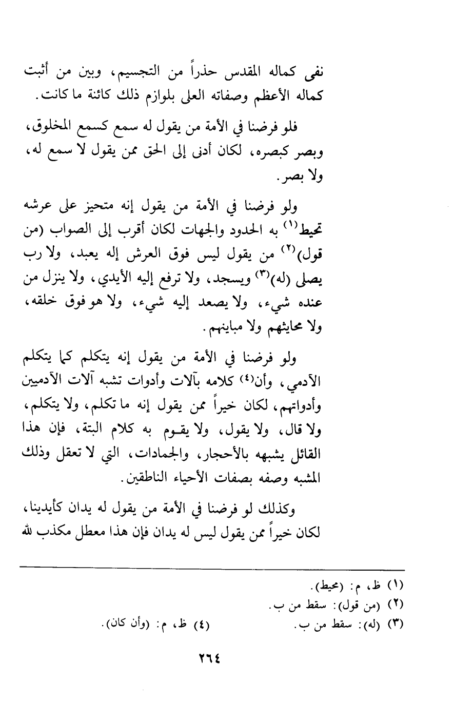 ولو فرضنا في الأمة من يقول إنه متحيز على عرشه تحيط به الحدود والجهات لكان أقرب إلى الصواب من قول من يقول ليس فوق العرش إله يعبد ولا رب يصلى له ويسجد ولا ترفع إليه الأيدي ولا ينزل من عنده شيء ولا يصعد إليه شيء ولا هو فوق خلقه ولا محايثهم ولا مباينهم.