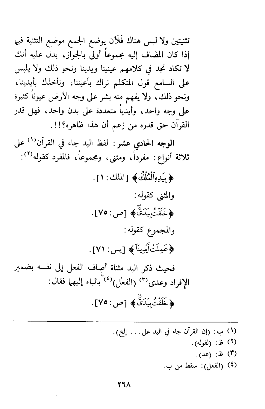 الوجه الحادي: عشر لفظ اليد جاء في القرآن على ثلاثة أنواع مفردا ومثنى ومجموعا فالمفرد كقوله {بِيَدِهِ الْمُلْكُ} [الملك1] والمثنى كقوله {خَلَقْتُ بِيَدَيَّ} [ص75] والمجموع كقوله {عَمِلَتْ أَيْدِينَا} [يس71] فحيث ذكر اليد مثناة أضاف الفعل إلى نفسه بضمير الإفراد وعدى الفعل بالباء إليهما فقال {خَلَقْتُ بِيَدَيّ} [ص75]