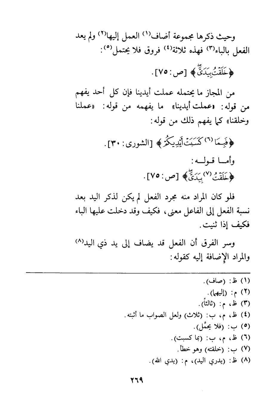 وحيث ذكرها مجموعة أضاف العمل إليها ولم يعد الفعل بالباء فهذه ثلاثة فروق فلا يحتمل {خَلَقْتُ بِيَدَيّ} [ص75] من المجاز ما يحتمله عملت أيدينا فإن كل أحد يفهم من قوله عملت أيدينا ما يفهمه من قوله عملنا وخلقنا كما يفهم ذلك من قوله {فَبِمَا كَسَبَتْ أَيْدِيكُمْ} [الشورى30] وأما قوله {خَلَقْتُ بِيَدَيّ} [ص75] فلو كان المراد منه مجرد الفعل لم يكن لذكر اليد بعد نسبة الفعل إلى الفاعل معنى فكيف وقد دخلت عليها الباء فكيف إذا ثنيت.