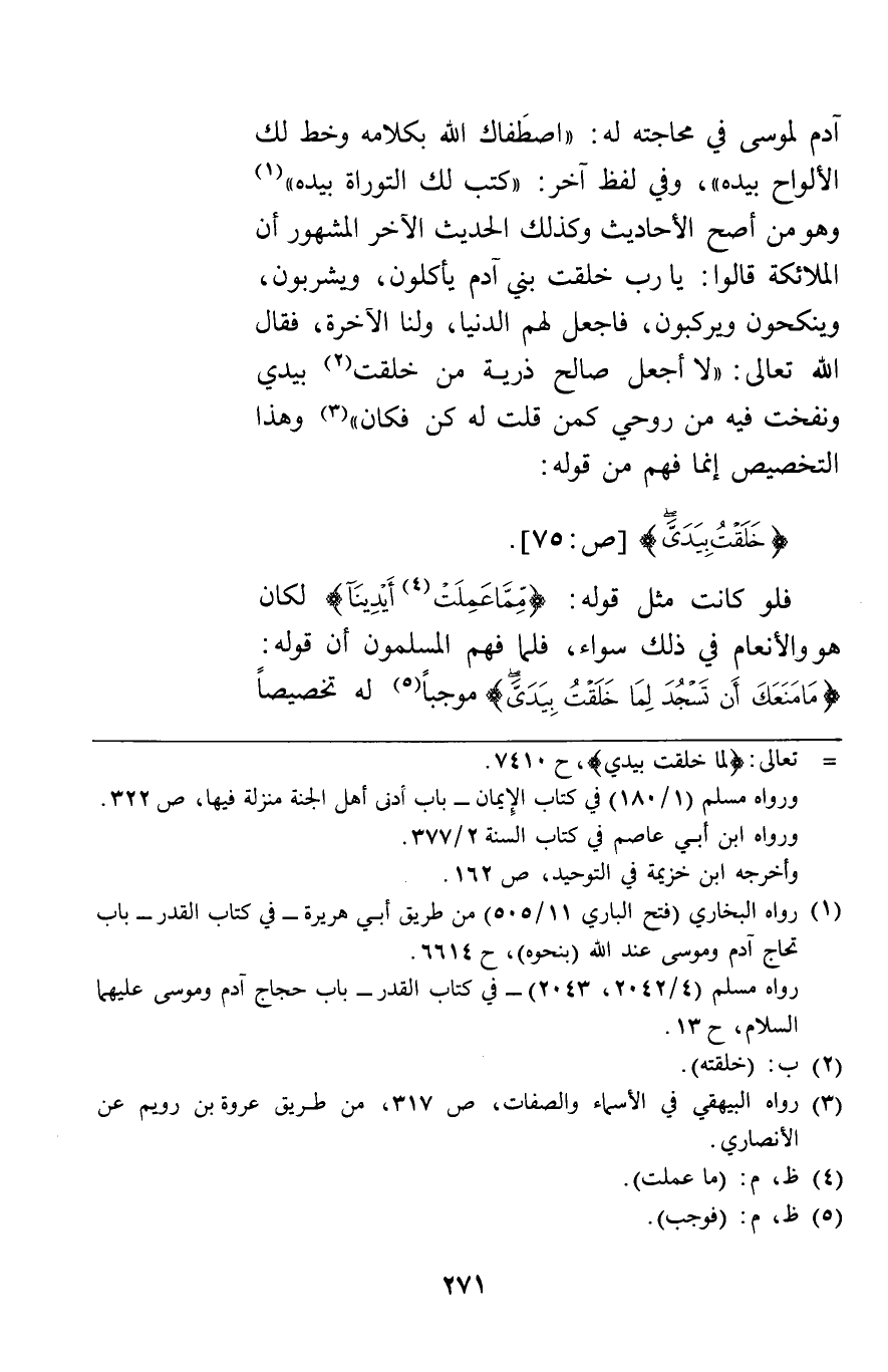 آدم لموسى في محاجته له اصطفاك الله بكلامه وخط لك الألواح بيده وفي لفظ آخر كتب لك التوراة بيده وهو من أصح الأحاديث وكذلك الحديث الآخر المشهور "أن الملائكة قالوا يا رب خلقت بني آدم يأكلون ويشربون وينكحون ويركبون فاجعل لهم الدنيا ولنا الآخرة فقال الله تعالى لا أجعل صالح ذرية من خلقت بيدي ونفخت فيه من روحي كمن قلت له كن فكان" وهذا التخصيص إنما فهم من قوله {خَلَقْتُ بِيَدَيّ} [ص75] فلو كانت مثل قوله {مِمَّا عَمِلَتْ أَيْدِينَا} لكان هو والأنعام في ذلك سواء فلما فهم المسلمون أن قوله {مَا مَنَعَكَ أَنْ تَسْجُدَ لِمَا خَلَقْتُ بِيَدَيّ} موجبا له تخصيصا