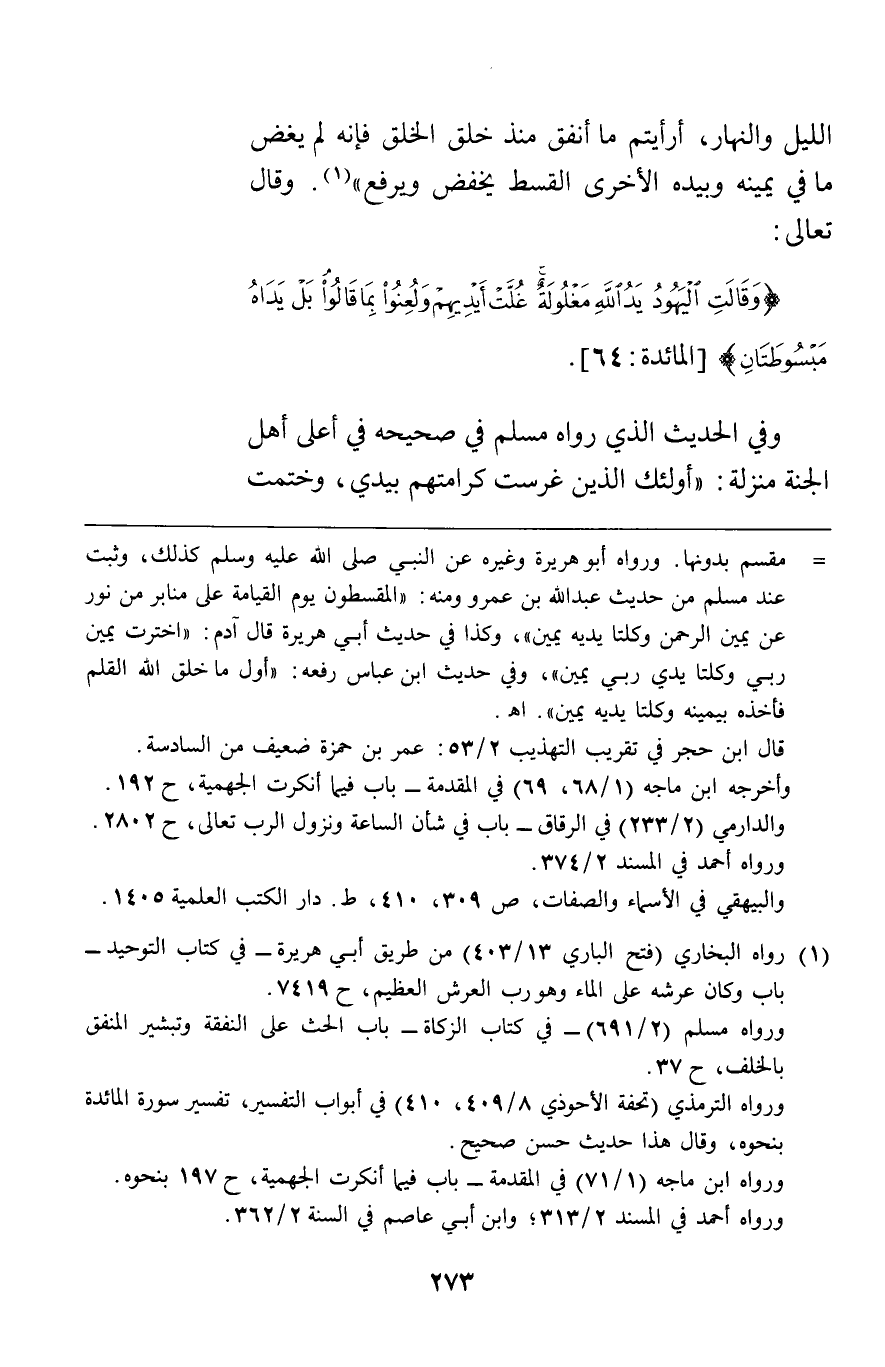 الليل والنهار أرأيتم ما أنفق منذ خلق الخلق فإنه لم يغض ما في يمينه وبيده الأخرى القسط يخفض ويرفع" وقال تعالى {وَقَالَتِ الْيَهُودُ يَدُ اللَّهِ مَغْلُولَةٌ غُلَّتْ أَيْدِيهِمْ وَلُعِنُوا بِمَا قَالُوا بَلْ يَدَاهُ مَبْسُوطَتَانِ} [المائدة64] وفي الحديث الذي رواه مسلم في صحيحه في أعلى أهل الجنة منزلة: " أولئك الذين غرست كرامتهم بيدي وختمت