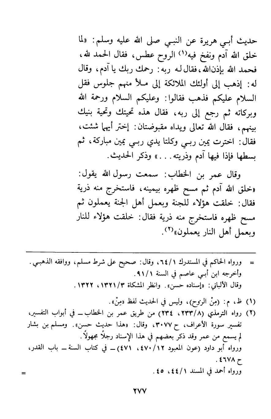 وقال عمر بن الخطاب سمعت رسول الله صلى الله عليه وسلم يقول: "خلق الله آدم ثم مسح ظهره بيمينه فاستخرج منه ذرية فقال خلقت هؤلاء للجنة وبعمل أهل الجنة يعملون ثم مسح ظهره فاستخرج منه ذرية فقال خلقت هؤلاء للنار وبعمل أهل النار يعملون.