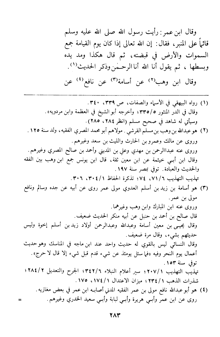 وقال ابن عمر رأيت رسول الله صلى الله عليه وسلم قائما على المنبر فقال: "إن الله تعالى إذا كان يوم القيامة جمع السموات والأرض في قبضته ثم قال هكذا ومد يده وبسطها ثم يقول أنا الله أنا الرحمن" وذكر الحديث. وقال ابن وهب عن أسامة عن نافع عن