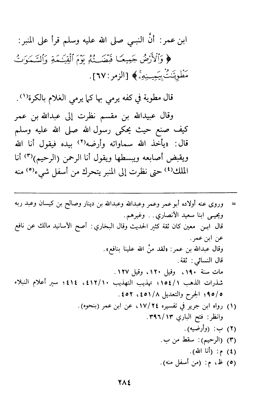 ابن عمر أن النبي قرأ على المنبر {وَالْأَرْضُ جَمِيعاً قَبْضَتُهُ يَوْمَ الْقِيَامَةِ وَالسَّمَاوَاتُ مَطْوِيَّاتٌ بِيَمِينِهِ} [الزمر67] قال: "مطوية في كفه يرمي بها كما يرمي الغلام بالكرة".