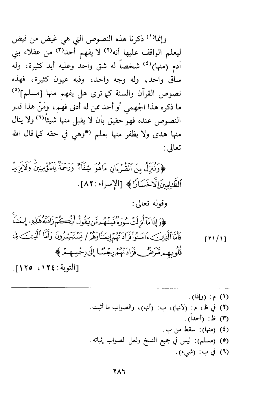 وإنما ذكرنا هذه النصوص التي هي غيض من فيض ليعلم الواقف عليها أنه لا يفهم أحد من عقلاء بني آدم منها شخصا له شق واحد وعليه أيد كثيرة وله ساق واحد وله وجه واحد وفيه عيون كثيرة فهذه نصوص القرآن والسنة كما ترى هل يفهم منها مسلم ما ذكره هذا الجهمي أو أحد ممن له أدنى فهم ومن هذا قدر النصوص عنده فهو حقيق بأن لا يقبل منها شيئا ولا ينال منها هدى ولا يظفر منها بعلم وهي في حقه كما قال الله تعالى {وَنُنَزِّلُ مِنَ الْقُرْآنِ مَا هُوَ شِفَاءٌ وَرَحْمَةٌ لِلْمُؤْمِنِينَ وَلا يَزِيدُ الظَّالِمِينَ إِلاَّ خَسَاراً} [الإسراء82] وقوله تعالى {وَإِذَا مَا أُنْزِلَتْ سُورَةٌ فَمِنْهُمْ مَنْ يَقُولُ أَيُّكُمْ زَادَتْهُ هَذِهِ إِيمَاناً فَأَمَّا الَّذِينَ آمَنُوا فَزَادَتْهُمْ إِيمَاناً وَهُمْ يَسْتَبْشِرُونَ وَأَمَّا الَّذِينَ فِي قُلُوبِهِمْ مَرَضٌ فَزَادَتْهُمْ رِجْساً إِلَى رِجْسِهِمْ} [التوبة125 , 124]