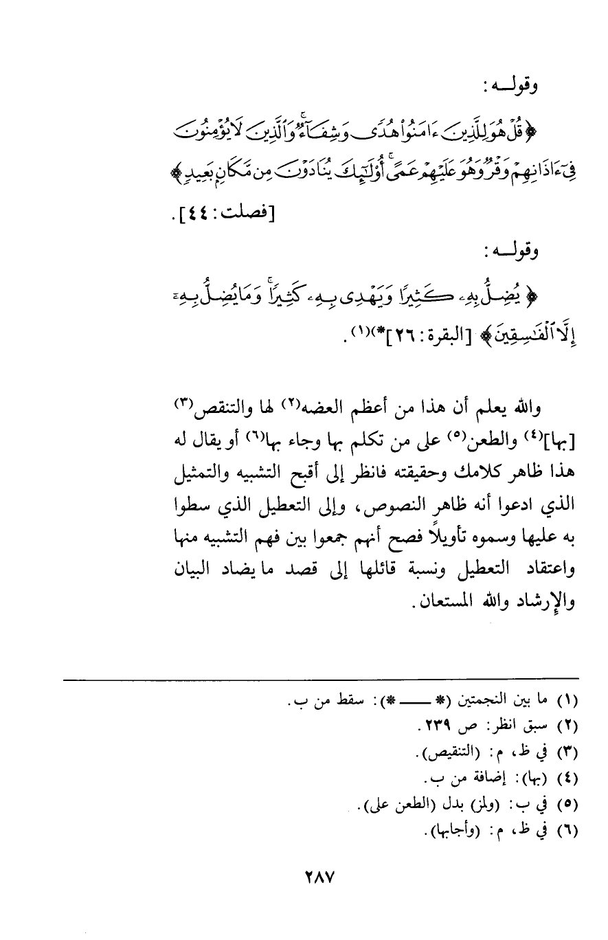 وقوله {وَلَوْ جَعَلْنَاهُ قُرْآناً أَعْجَمِيّاً لَقَالُوا لَوْلا فُصِّلَتْ آيَاتُهُ أَأَعْجَمِيٌّ وَعَرَبِيٌّ قُلْ هُوَ لِلَّذِينَ آمَنُوا هُدىً وَشِفَاءٌ وَالَّذِينَ لا يُؤْمِنُونَ فِي آذَانِهِمْ وَقْرٌ وَهُوَ عَلَيْهِمْ عَمىً أُولَئِكَ يُنَادَوْنَ مِنْ مَكَانٍ بَعِيدٍ} [فصلت44] وقوله {يُضِلُّ بِهِ كَثِيراً وَيَهْدِي بِهِ كَثِيراً وَمَا يُضِلُّ بِهِ إِلاَّ الْفَاسِقِينَ} [البقرة26] والله يعلم أن هذا من أعظم العضه لها والتنقص بها والطعن على من تكلم بها وجاء بها أو يقال له هذا ظاهر كلامك وحقيقته فانظر إلى أقبح التشبيه والتمثيل الذي ادعوا أنه ظاهر النصوص وإلى التعطيل الذي سطوا به عليها وسموه تأويلا فصح أنهم جمعوا بين فهم التشبيه منها واعتقاد التعطيل ونسبة قائلها إلى قصد ما يضاد البيان والإرشاد والله المستعان.
