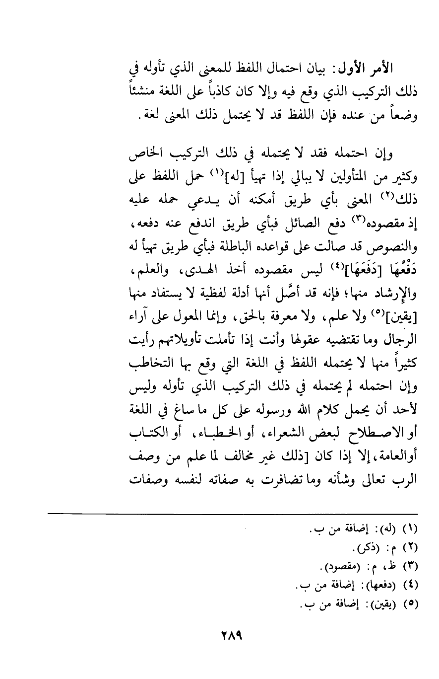 الأمر الأول بيان احتمال اللفظ للمعنى الذي تأوله في ذلك التركيب الذي وقع فيه وإلا كان كاذبا على اللغة منشئا وضعا من عنده فإن اللفظ قد لا يحتمل ذلك المعنى لغة.