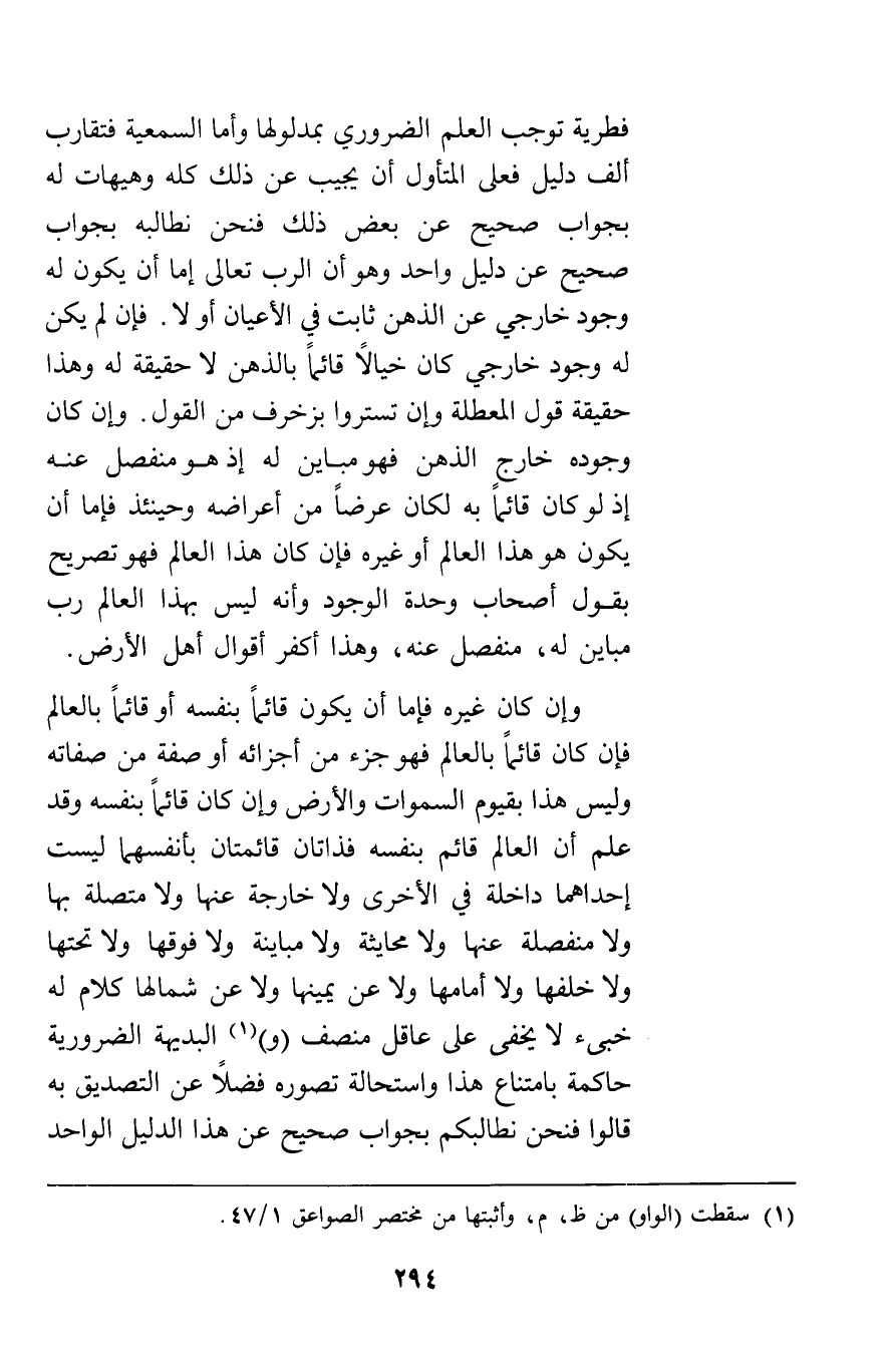 فطرية توجب العلم الضروري بمدلولها وأما السمعية فتقارب الف دليل فعلى المتأول أن يجيب عن ذلك كله وهيهات له بجواب صحيح عن بعض ذلك فنحن نطالبه بجواب صحيح عن دليل واحد وهو أن الرب تعالى إما أن يكون له وجود خارجي عن الذهن ثابت في الأعيان أولا فإن لم يكن له وجود خارجي كان خيالا قائما بالذهن لا حقيقة له وهذا حقيقة قول المعطلة وإن تستروا بزخرف من القول وإن كان وجوده خارج الذهن فهو مباين له إذ هو منفصل عنه إذ لو كان قائما به لكان عرضا من أعراضه وحينئذ فإما أن يكون هو هذا العالم أو غيره فإن كان هذا العالم فهو تصريح بقول أصحاب وحدة الوجود وأنه ليس لهذا العالم رب مباين له منفصل عنه وهذا أكفر أقوال أهل الأرض وإن كان غيره فإما أن يكون قائما بنفسه أو قائما بالعالم فإن كان قائما بالعالم فهو جزء من أجزائه أو صفة من صفاته وليس هذا بقيوم السموات والأرض وإن كان قائما بنفسه وقد علم أن العالم قائم بنفسه فذاتان قائمتان بأنفسهما ليست إحداهما داخلة في الأخرى ولا خارجة عنها ولا متصلة بها ولا منفصلة عنها ولا محايثة ولا مباينة ولا فوقها ولا تحتها ولا خلفها ولا أمامها ولا عن يمينها ولا عن شمالها كلام له خبىء لا يخفى على عاقل منصف والبديهة الضرورية حاكمة بامتناع هذا واستحالة تصوره فضلا عن التصديق به قالوا فنحن نطالبكم بجواب صحيح عن هذا الدليل الواحد