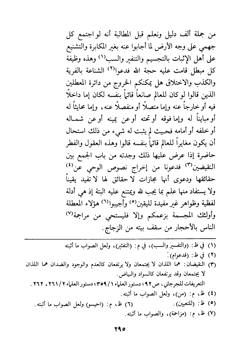 من جملة ألف دليل ونعلم قبل المطالبة أنه لو اجتمع كل جهمي على وجه الأرض لما أجابوا عنه بغير المكابرة والتشنيع على أهل الإثبات بالتجسيم والتنفير والسب وهذه وظيفة كل مبطل قامت عليه حجة الله فدعوا الشناعة بالفرية والكذب والاختلاق هل يمكنكم الخروج من دائرة المعطلين الذين قالوا لو كان للعالم صانع قائم بنفسه لكان إما داخلا فيه أو خارجا عنه وإما متصلا أو منفصلا عنه وإما محايثا له أو مباينا له وإما فوقه أو تحته أو عن يمينه أو عن شماله أو خلفه أو أمامه فحيث لم يثبت له شيء من ذلك استحال أن يكون مغايرا للعالم قائما بنفسه قالوا وهذه العقول والفطر حاضرة إذا عرض عليها ذلك وجدته من باب الجمع بين النقيضين فدعونا من إخراج نصوص الوحي عن حقائقها ودعوى أنها مجازات لا حقائق لها لا تفيد يقينا ولا يستفاد منها علم بما يجب لله ويمتنع عليه البتة إذ هي أدلة لفظية وظواهر غير مفيدة لليقين وأجيبوا هؤلاء المعطلة وأولئك المجسمة بزعمكم وإلا فليستحي من مراجمة الناس بالأحجار من سقف بيته من الزجاج