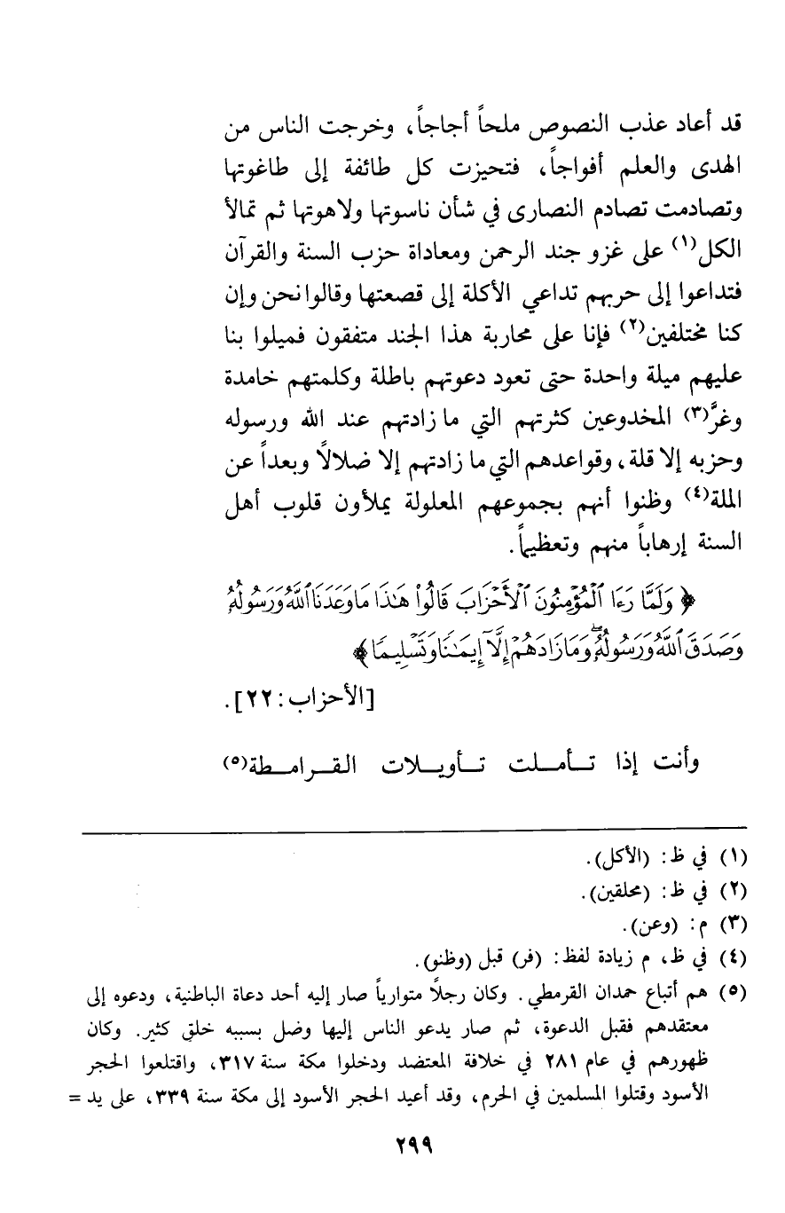 قد أعاد عذب النصوص ملحا أجاجا وخرجت الناس من الهدى والعلم أفواجا فتحيزت كل طائفة إلى طاغوتها وتصادمت تصادم النصارى في شأن ناسوتها ولاهوتها ثم تمالأ الكل على غزو جند الرحمن ومعاداة حزب السنة والقرآن فتداعوا إلى حربهم تداعي الأكلة إلى قصعتها وقالوا نحن وإن كنا مختلفين فإنا على محاربة هذا الجند متفقون فميلوا بنا عليهم ميلة واحدة حتى تعود دعوتهم باطلة وكلمتهم خامدة وغر المخدوعين كثرتهم التي ما زادتهم عند الله ورسوله وحزبه إلا قلة وقواعدهم التي ما زادتهم إلا ضلالا وبعدا عن الملة وظنوا أنهم بجموعهم المعلولة يملأون قلوب أهل السنة إرهابا منهم وتعظيما. {وَلَمَّا رَأى الْمُؤْمِنُونَ الأَحْزَابَ قَالُوا هَذَا مَا وَعَدَنَا اللَّهُ وَرَسُولُهُ وَصَدَقَ اللَّهُ وَرَسُولُهُ وَمَا زَادَهُمْ إِلاَّ إِيمَاناً وَتَسْلِيماً} [الأحزاب22] وأنت إذا تأملت تأويلات القرامطة