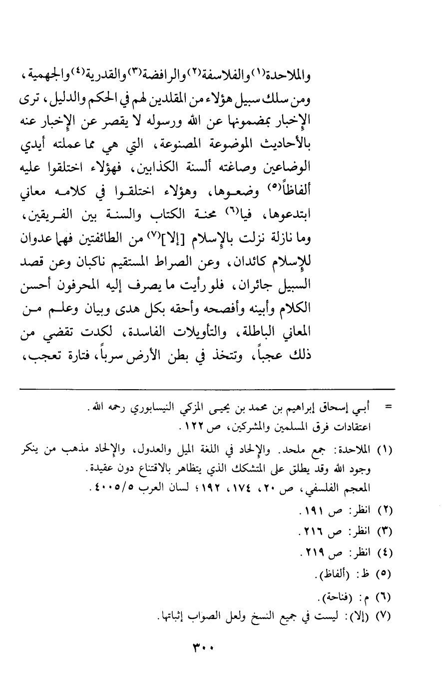 والملاحدة والفلاسفة والرافضة والقدرية والجهمية ومن سلك سبيل هؤلاء من المقلدين لهم في الحكم والدليل ترى الإخبار بمضمونها عن الله ورسوله لا يقصر عن الإخبار عنه بالأحاديث الموضوعة المصنوعة التي هي مما عملته أيدي الوضاعين وصاغته ألسنة الكذابين فهؤلاء اختلقوا عليه ألفاظا وضعوها وهؤلاء اختلقوا في كلامه معاني ابتدعوها فيا محنة الكتاب والسنة بين الفريقين وما نازلة نزلت بالإسلام إلا من الطائفتين فهما عدوان للإسلام كائدان وعن الصراط المستقيم ناكبان وعن قصد السبيل جائران فلو رأيت ما يصرف إليه المحرفون أحسن الكلام وأبينه وأفصحه وأحقه بكل هدى وبيان وعلم من المعاني الباطلة والتأويلات الفاسدة لكدت تقضي من ذلك عجبا وتتخذ في بطن الأرض سربا فتارة تعجب