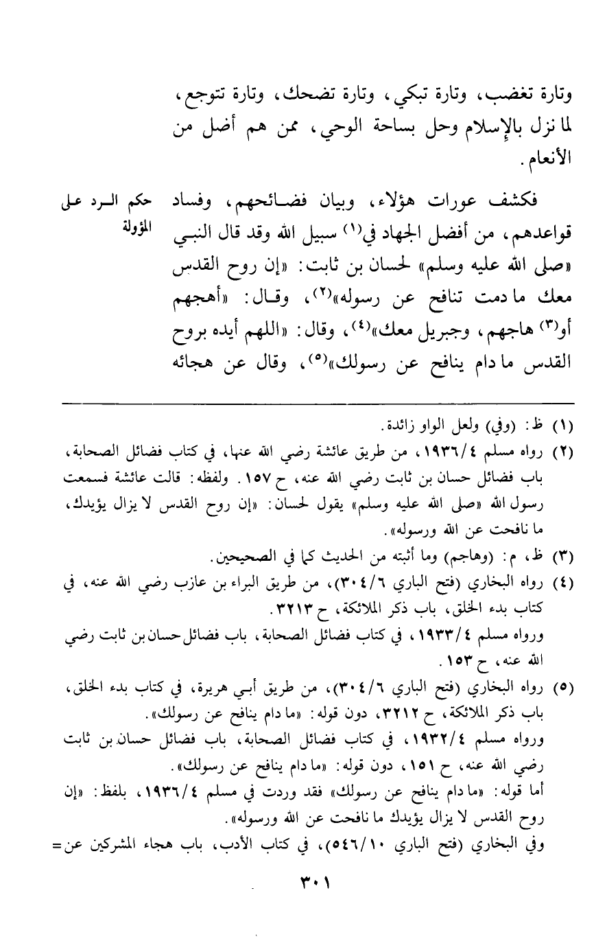 فكشف عورات هؤلاء وبيان فضائحهم وفساد قواعدهم من أفضل الجهاد في سبيل الله وقد قال النبي صلى الله عليه وسلم لحسان بن ثابت: "إن روح القدس معك ما دمت تنافح عن رسوله" وقال: "أهجهم أو هاجهم وجبريل معك" وقال: "اللهم أيده بروح القدس ما دام ينافح عن رسولك " وقال عن هجائه