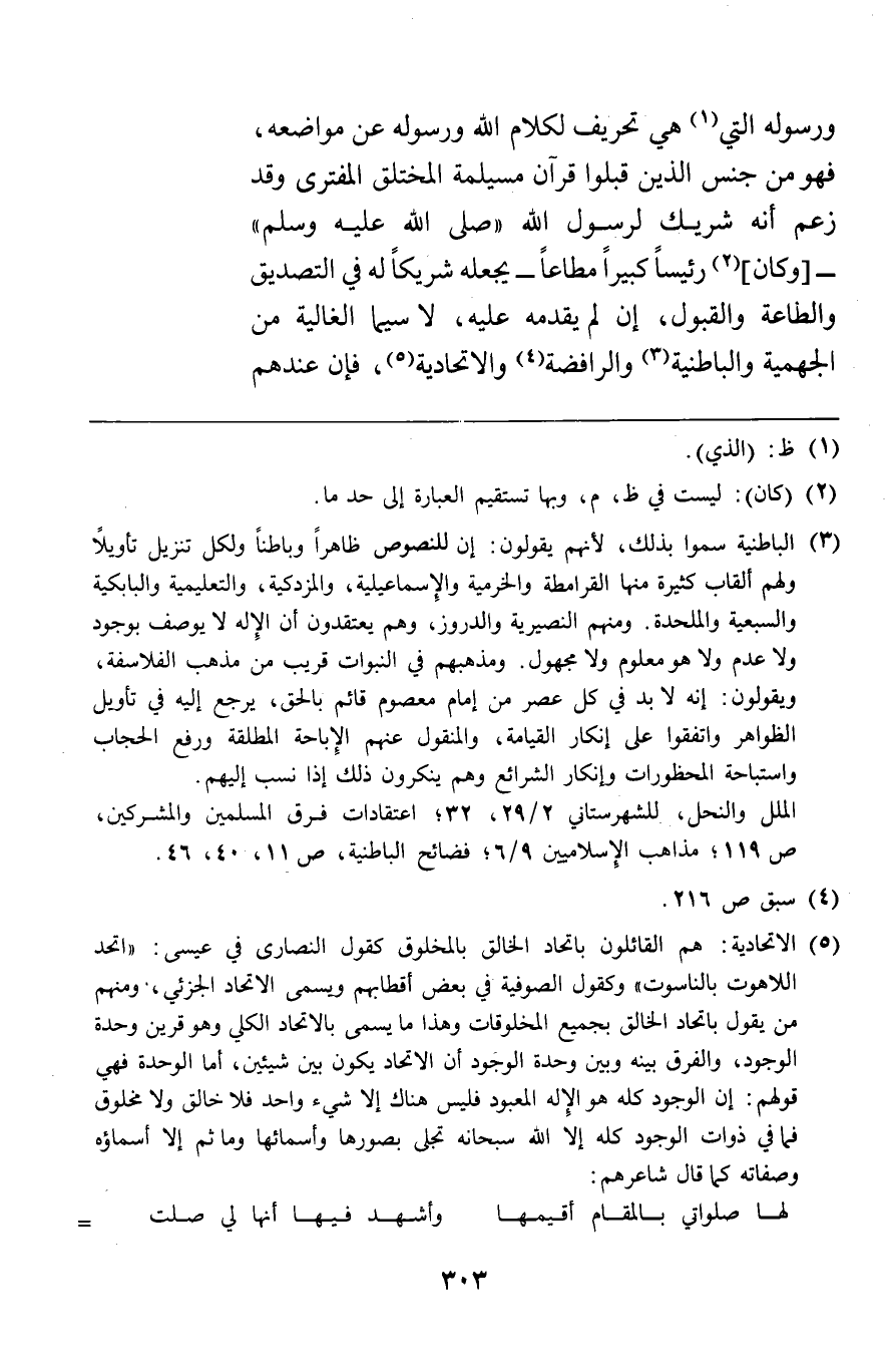 ورسوله التي هي تحريف لكلام الله ورسوله عن مواضعه فهو من جنس الذين قبلوا قرآن مسيلمة المختلق المفترى وقد زعم أنه شريك لرسول الله صلى الله عليه وسلم وكان رئيسا كبيرا مطاعا بجعله شريكا له في التصديق والطاعة والقبول إن لم يقدمه عليه لا سيما الغالية من الجهمية والباطنية والرافضة والاتحادية فإن عندهم