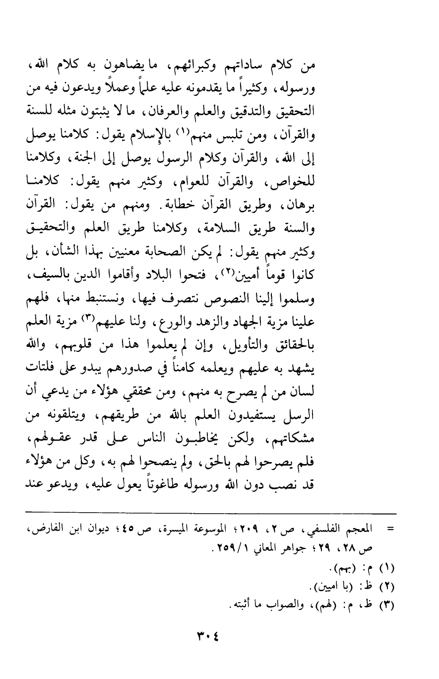 من كلام ساداتهم وكبرائهم ما يضاهون به كلام الله ورسوله وكثيرا ما يقدمونه عليه علما وعملا ويدعون فيه من التحقيق والتدقيق والعلم والعرفان ما لا يثبتون مثله للسنة والقرآن ومن تلبس منهم بالإسلام يقول كلامنا يوصل إلى الله والقرآن وكلام الرسول يوصل إلى الجنة وكلامنا للخواص والقرآن للعوام وكثير منهم يقول كلامنا برهان وطريق القرآن خطابة ومنهم من يقول القرآن والسنة طريق السلامة وكلامنا طريق العلم والتحقيق وكثير منهم يقول لم يكن الصحابة معنيين بهذا الشأن بل كانوا قوما أميين فتحوا البلاد وأقاموا الدين بالسيف وسلموا إلينا النصوص نتصرف فيها ونستنبط منها فلهم علينا مزية الجهاد والزهد والورع ولنا عليهم مزية العلم بالحقائق والتأويل وإن لم يعلموا هذا من قلوبهم والله يشهد به عليهم ويعلمه كامنا في صدورهم يبدو على فلتات لسان من لم يصرح به منهم ومن محققي هؤلاء من يدعي أن الرسل يستفيدون العلم بالله من طريقهم ويتلقونه من مشكاتهم ولكن يخاطبون الناس على قدر عقولهم فلم يصرحوا لهم بالحق ولم ينصحوا لهم به وكل من هؤلاء قد نصب دون الله ورسوله طاغوتا يعول عليه ويدعو عند