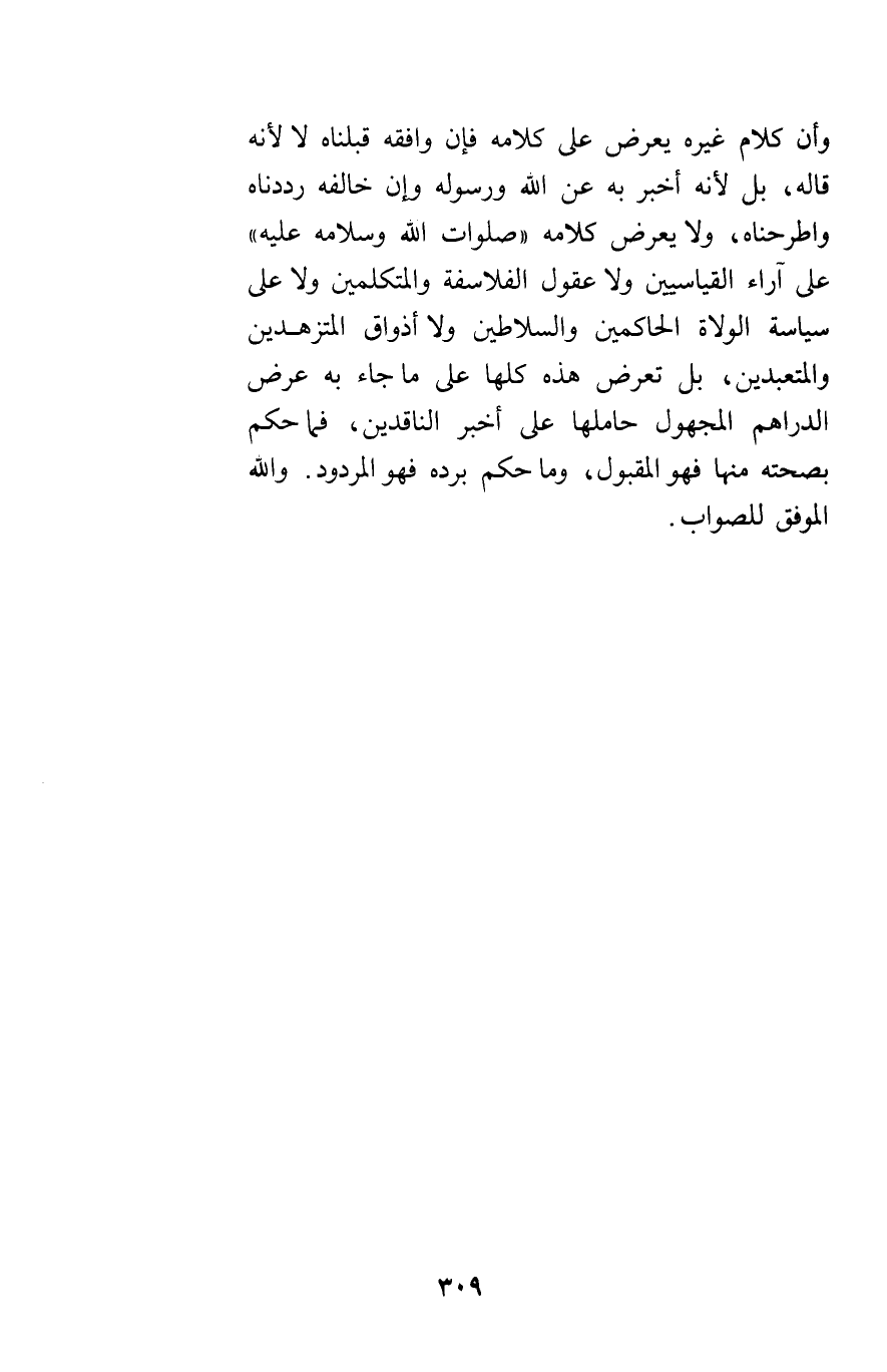 وأن كلام غيره يعرض على كلامه فإن وافقه قبلناه لا لأنه قاله بل لأنه أخبر به عن الله ورسوله وإن خالفه رددناه واطرحناه ولا يعرض كلامه على آراء القياسيين ولا عقول الفلاسفة والمتكلمين ولا على سياسة الولاة الحاكمين والسلاطين ولا أذواق المتزهدين والمتعبدين بل تعرض هذه كلها على ما جاء به عرض الدراهم المجهول حاملها على أخبر الناقدين فما حكم بصحته منها فهو المقبول وما حكم برده فهو المردود والله الموفق للصواب