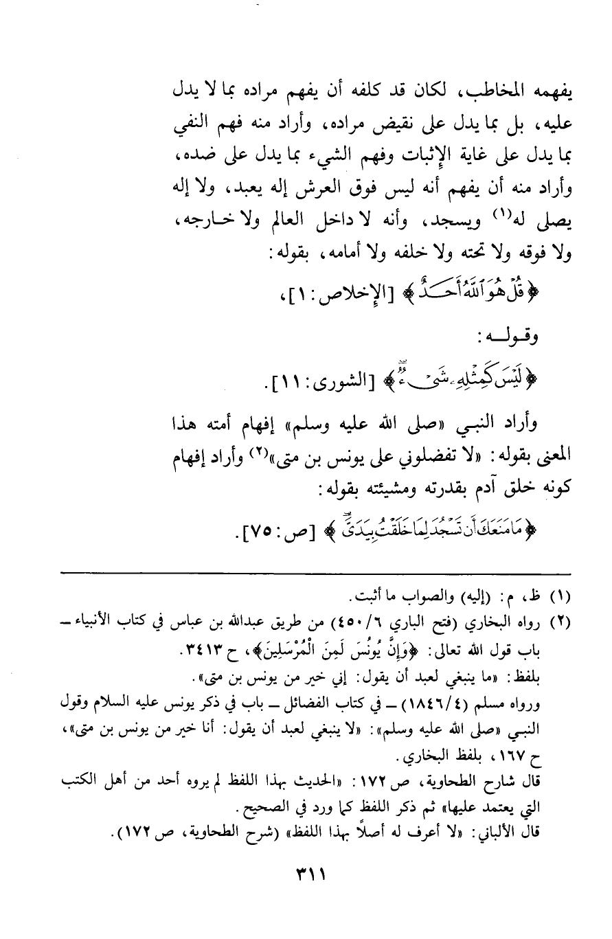 يفهمه المخاطب لكان قد كلفه أن يفهم مراده بما لا يدل عليه بل بما يدل على نقيض مراده وأراد منه فهم النفي بما يدل على غاية الإثبات وفهم الشيء بما يدل على ضده وأراد منه أن يفهم أنه ليس فوق العرش إله يعبد ولا إله يصلى له ويسجد وأنه لا داخل العالم ولا خارجه ولا فوقه ولا تحته ولا خلفه ولا أمامه بقوله {قُلْ هُوَ اللَّهُ أَحَدٌ} [الإخلاص1] قوله {لَيْسَ كَمِثْلِهِ شَيْءٌ} [الشورى11] وأراد النبي إفهام أمته هذا المعنى بقوله: "لا تفضلوني على يونس بن متى" وأراد إفهام كونه خلق آدم بقدرته ومشيئته بقوله {مَا مَنَعَكَ أَنْ تَسْجُدَ لِمَا خَلَقْتُ بِيَدَيّ} [ص75]