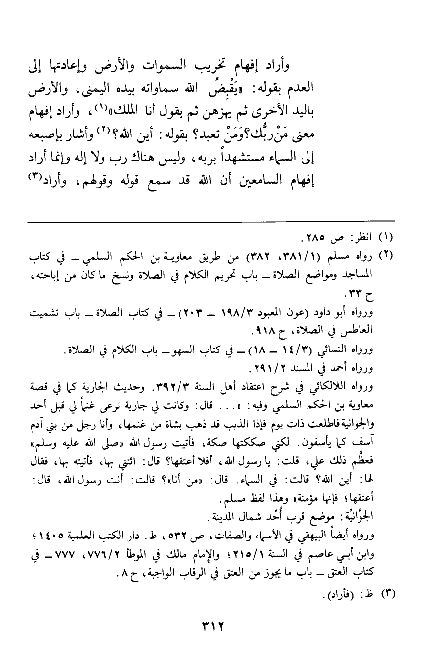 وأراد إفهام تخريب السموات والأرض وإعادتها إلى العدم بقوله: "يقبض الله سماواته بيده اليمنى والأرض باليد الأخرى ثم يهزهن ثم يقول أنا الملك" وأراد إفهام معنى من ربك ومن تعبد بقوله أين الله واشار بإصبعه إلى السماء مستشهدا بربه وليس هناك رب ولا إله وإنما أراد إفهام السامعين أن الله قد سمع قوله وقولهم وأراد