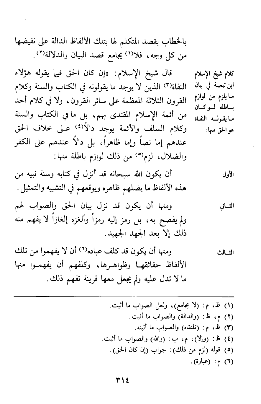 قال شيخ الإسلام إن كان الحق فيما يقوله هؤلاء النفاة الذين لا يوجد ما يقولونه في الكتاب والسنة وكلام القرون الثلاثة المعظمة على سائر القرون ولا في كلام أحد من أئمة الإسلام المقتدى بهم بل ما في الكتاب والسنة وكلام السلف والأئمة يوجد دالا على خلاف الحق عندهم إما نصا وإما ظاهرا بل دالا عندهم على الكفر والضلال لزم من ذلك لوازم باطلة منها