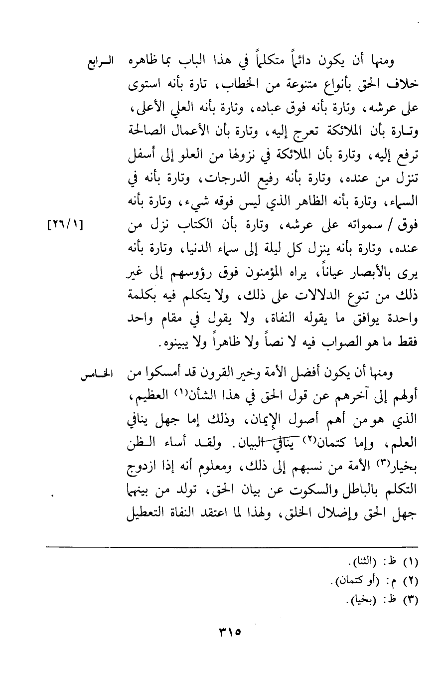 الخامس: ومنها أن يكون أفضل الأمة وخير القرون قد أمسكوا من أولهم إلى آخرهم عن قول الحق في هذا الشأن العظيم الذي هو من أهم أصول الإيمان وذلك إما جهل ينافي العلم وإما كتمان ينافي البيان ولقد أساء الظن بخيار الأمة من نسبهم إلى ذلك ومعلوم أنه إذا ازدوج التكلم بالباطل والسكوت عن بيان الحق تولد من بينهما جهل الحق وإضلال الخلق ولهذا لما اعتقد النفاة التعطيل