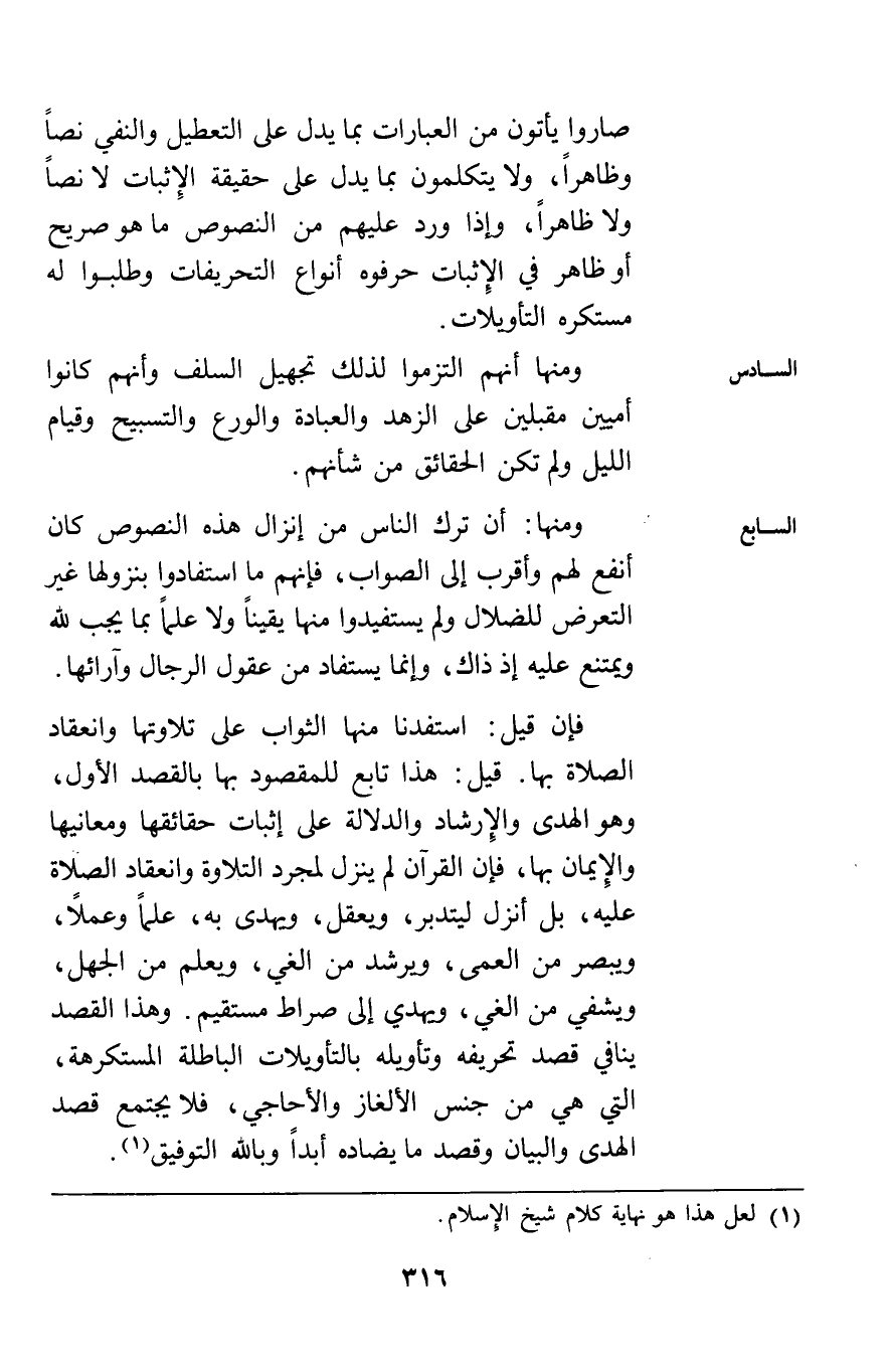 السابع: ومنها أن ترك الناس من إنزال هذه النصوص كان أنفع لهم وأقرب إلى الصواب فإنهم ما استفادوا بنزولها غير التعرض للضلال ولم يستفيدوا منها يقينا ولا علما بما يجب لله ويمتنع عليه إذ ذاك وإنما يستفاد من عقول الرجال وآرائها.