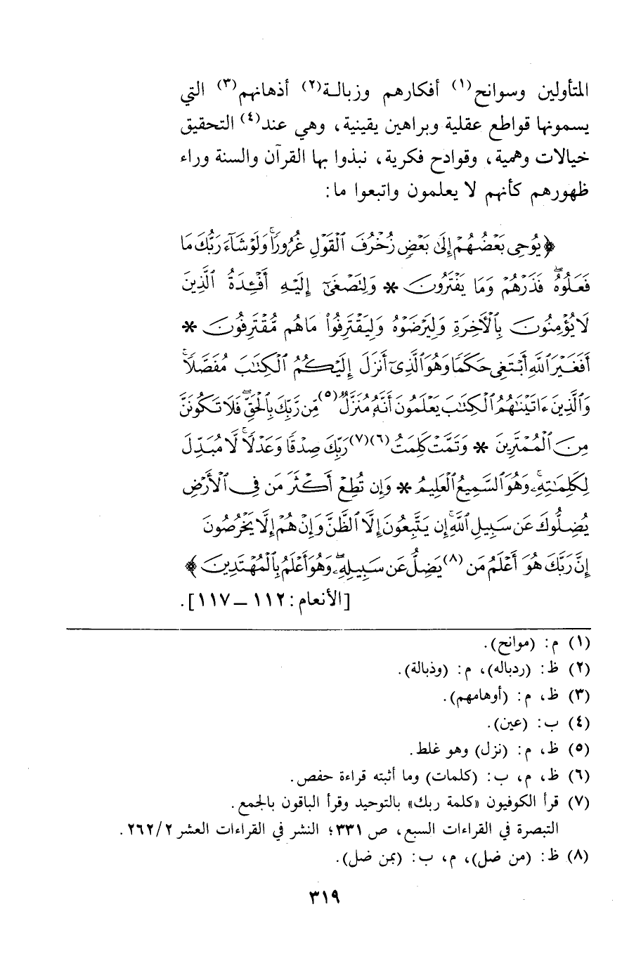 المتأولين وسوانح أفكارهم وزبالة أذهانهم التي يسمونها قواطع عقلية وبراهين يقينية وهي عند التحقيق خيالات وهمية وقوادح فكرية نبذوا بها القرآن والسنة وراء ظهورهم كأنهم لا يعلمون واتبعوا ما {يُوحِي بَعْضُهُمْ إِلَى بَعْضٍ زُخْرُفَ الْقَوْلِ غُرُوراً وَلَوْ شَاءَ رَبُّكَ مَا فَعَلُوهُ فَذَرْهُمْ وَمَا يَفْتَرُونَ وَلِتَصْغَى إِلَيْهِ أَفْئِدَةُ الَّذِينَ لا يُؤْمِنُونَ بِالآخِرَةِ وَلِيَرْضَوْهُ وَلِيَقْتَرِفُوا مَا هُمْ مُقْتَرِفُونَ أَفَغَيْرَ اللَّهِ أَبْتَغِي حَكَماً وَهُوَ الَّذِي أَنْزَلَ إِلَيْكُمُ الْكِتَابَ مُفَصَّلاً وَالَّذِينَ آتَيْنَاهُمُ الْكِتَابَ يَعْلَمُونَ أَنَّهُ مُنَزَّلٌ مِنْ رَبِّكَ بِالْحَقِّ فَلا تَكُونَنَّ مِنَ الْمُمْتَرِينَ وَتَمَّتْ كَلِمَتُ رَبِّكَ صِدْقاً وَعَدْلاً لا مُبَدِّلَ لِكَلِمَاتِهِ وَهُوَ السَّمِيعُ الْعَلِيمُ وَإِنْ تُطِعْ أَكْثَرَ مَنْ فِي الأَرْضِ يُضِلُّوكَ عَنْ سَبِيلِ اللَّهِ إِنْ يَتَّبِعُونَ إِلاَّ الظَّنَّ وَإِنْ هُمْ إِلاَّ يَخْرُصُونَ إِنَّ رَبَّكَ هُوَ أَعْلَمُ مَنْ يَضِلُّ عَنْ سَبِيلِهِ وَهُوَ أَعْلَمُ بِالْمُهْتَدِينَ} [الأنعام117-112]