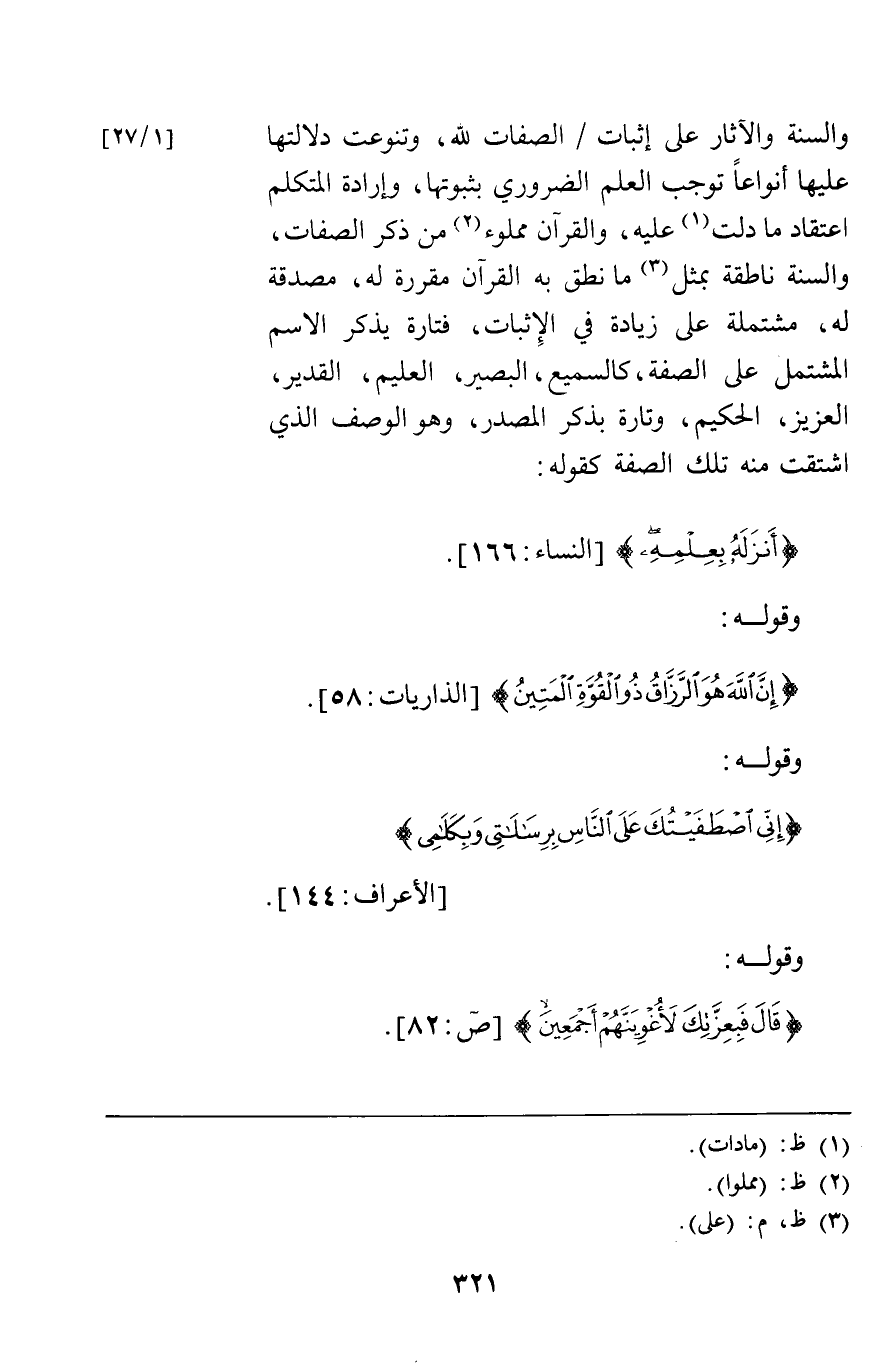 والسنة والآثار على إثبات الصفات لله وتنوعت دلالتها عليها أنواعا توجب العلم الضروري بثبوتها وإرادة المتكلم اعتقاد ما دلت عليه والقرآن مملوء من ذكر الصفات والسنة ناطقة بمثل مانطق به القرآن مقررة له مصدقة له مشتملة على زيادة في الإثبات فتارة بذكر الاسم المشتمل على الصفة كالسميع البصير العليم القدير العزيز الحكيم وتارة بذكر المصدر وهو الوصف الذي اشتقت منه تلك الصفة كقوله {أَنْزَلَهُ بِعِلْمِهِ} [النساء166] وقوله {إِنَّ اللَّهَ هُوَ الرَّزَّاقُ ذُو الْقُوَّةِ الْمَتِينُ} [الذاريات58] وقوله {إِنِّي اصْطَفَيْتُكَ عَلَى النَّاسِ بِرِسَالاتِي وَبِكَلامِي} [الأعراف144] وقوله {قَالَ فَبِعِزَّتِكَ لأُغْوِيَنَّهُمْ أَجْمَعِينَ} [ص82]