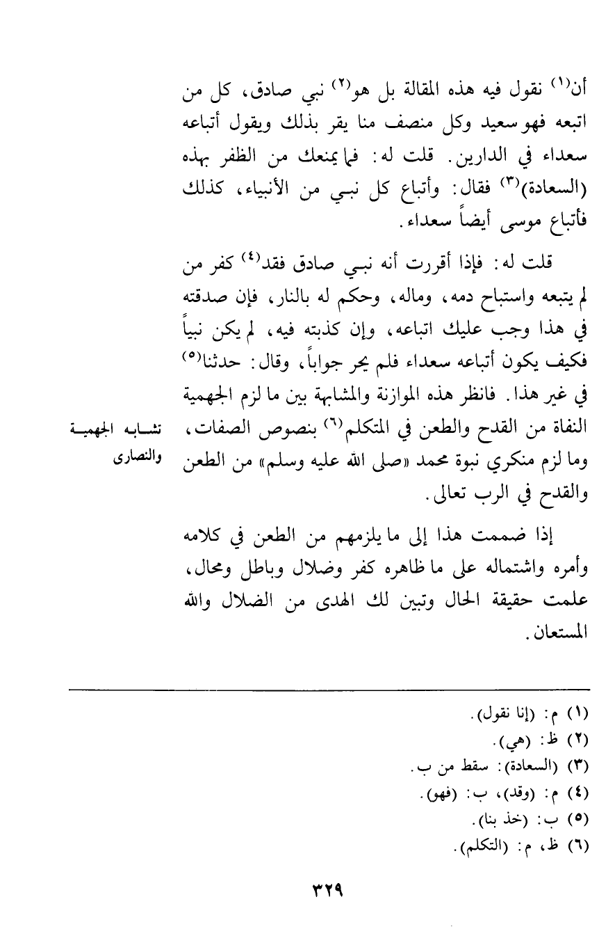 قلت له فإذا أقررت أنه نبي صادق فقد كفر من لم يتبعه واستباح دمه وماله وحكم له بالنار فإن صدقته في هذا وجب عليك اتباعه وإن كذبته فيه لم يكن نبيا فكيف يكون أتباعه سعداء فلم يحر جوابا وقال حدثنا في غير هذا فانظر هذه الموازنة والمشابهة بين مالزم الجهمية النفاة من القدح والطعن في المتكلم بنصوص الصفات وما لزم منكري نبوة محمد من الطعن والقدح في الرب تعالى.