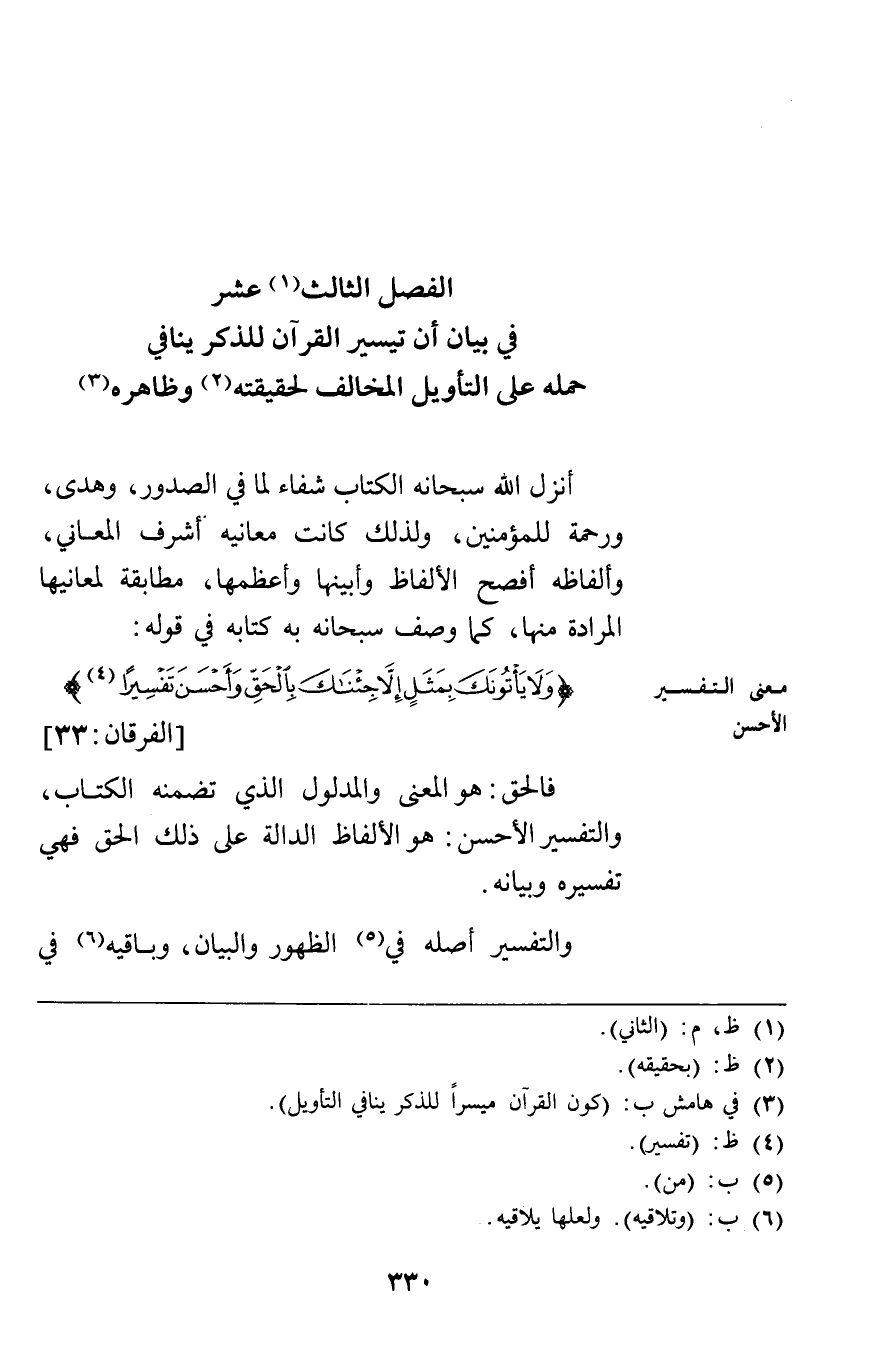 الفصل الثالث عشر: في بيان أن تيسير القرآن للذكر ينافي حمله على التأويل المخالف لحقيقته وظاهره