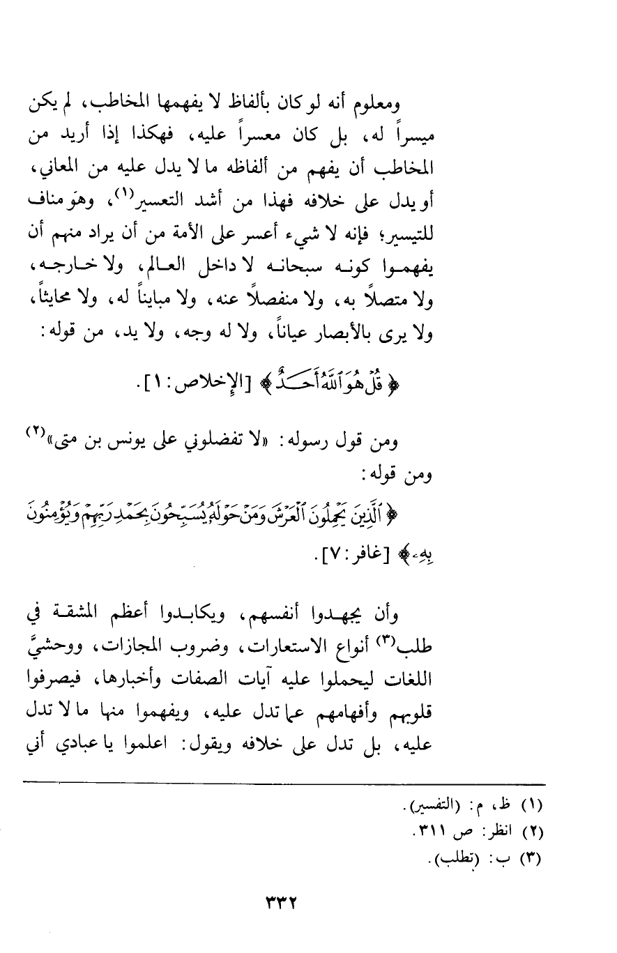 ومعلوم أنه لو كان بألفاظ لا يفهمها المخاطب لم يكن ميسرا له بل كان معسرا عليه فهكذا إذا أريد من المخاطب أن يفهم من ألفاظه ما لا يدل عليه من المعاني أو يدل على خلافه فهذا من أشد التعسير وهو مناف للتيسير فإنه لا شيء أعسر على الأمة من أن يراد منهم أن يفهموا كونه سبحانه لا داخل العالم ولا خارجه ولا متصلا به ولا منفصلا عنه ولا مباينا له ولا محايثا ولا يرى بالأبصار عيانا ولا له وجه ولا يد من قوله {قُلْ هُوَ اللَّهُ أَحَدٌ} [الإخلاص1] ومن قول رسوله: "لا تفضلوني على يونس بن متى" ومن قوله {الَّذِينَ يَحْمِلُونَ الْعَرْشَ وَمَنْ حَوْلَهُ يُسَبِّحُونَ بِحَمْدِ رَبِّهِمْ وَيُؤْمِنُونَ بِهِ} [غافر7] وأن يجهدوا أنفسهم ويكابدوا أعظم المشقة في طلب أنواع الاستعارات وضروب المجازات ووحشي اللغات ليحملوا عليه آيات الصفات وأخبارها فيصرفوا قلوبهم وأفهامهم عما تدل عليه ويفهموا منها ما لا تدل عليه بل تدل على خلافه ويقول اعلموا يا عبادي أني