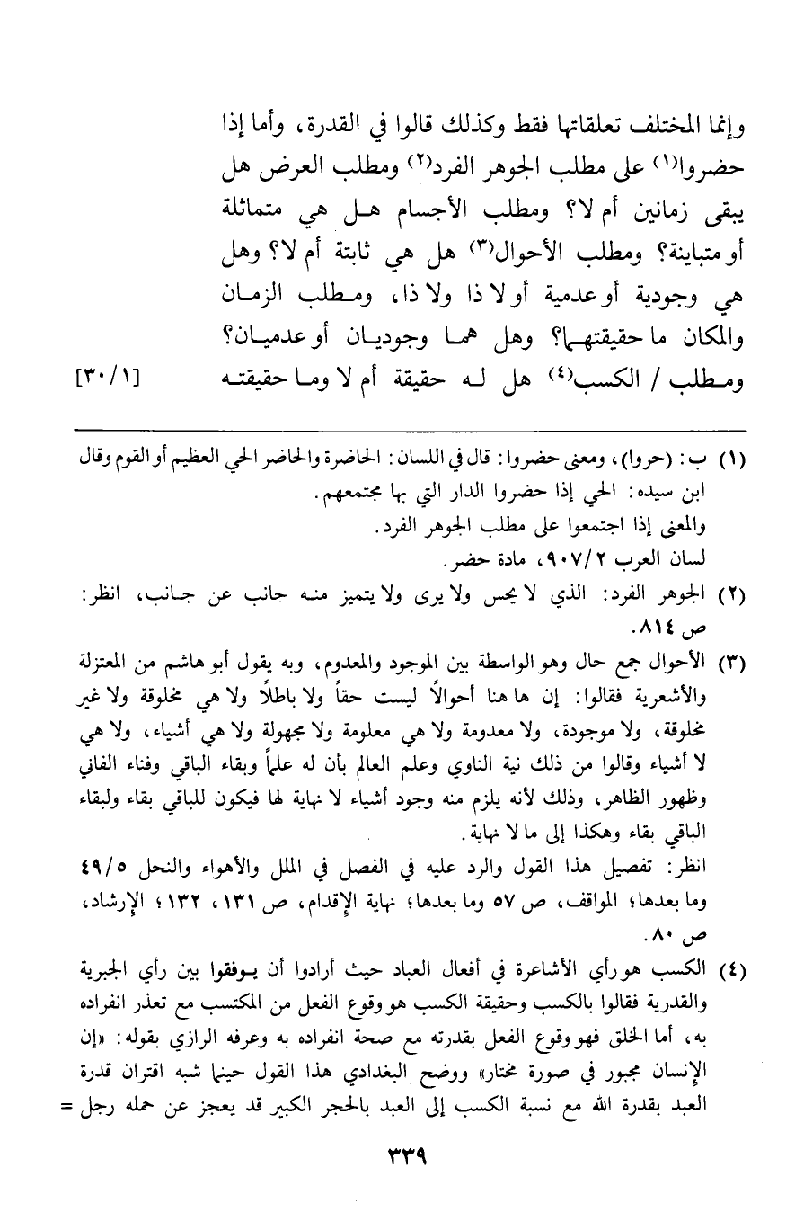 وإنما المختلف تعلقاتها فقط وكذلك قالوا في القدرة وأما إذا حضروا على مطلب الجوهر الفرد ومطلب العرض هل يبقى زمانين أم لا ومطلب الأجسام هل هي متماثلة أو متباينة ومطلب الأحوال هل هي ثابتة أم لا وهل هي وجودية أو عدمية أو لا ذا ولا ذا ومطلب الزمان والمكان ما حقيقتهما وهل هما وجوديان أو عدميان ومطلب الكسب هل له حقيقة أم لا وما حقيقته