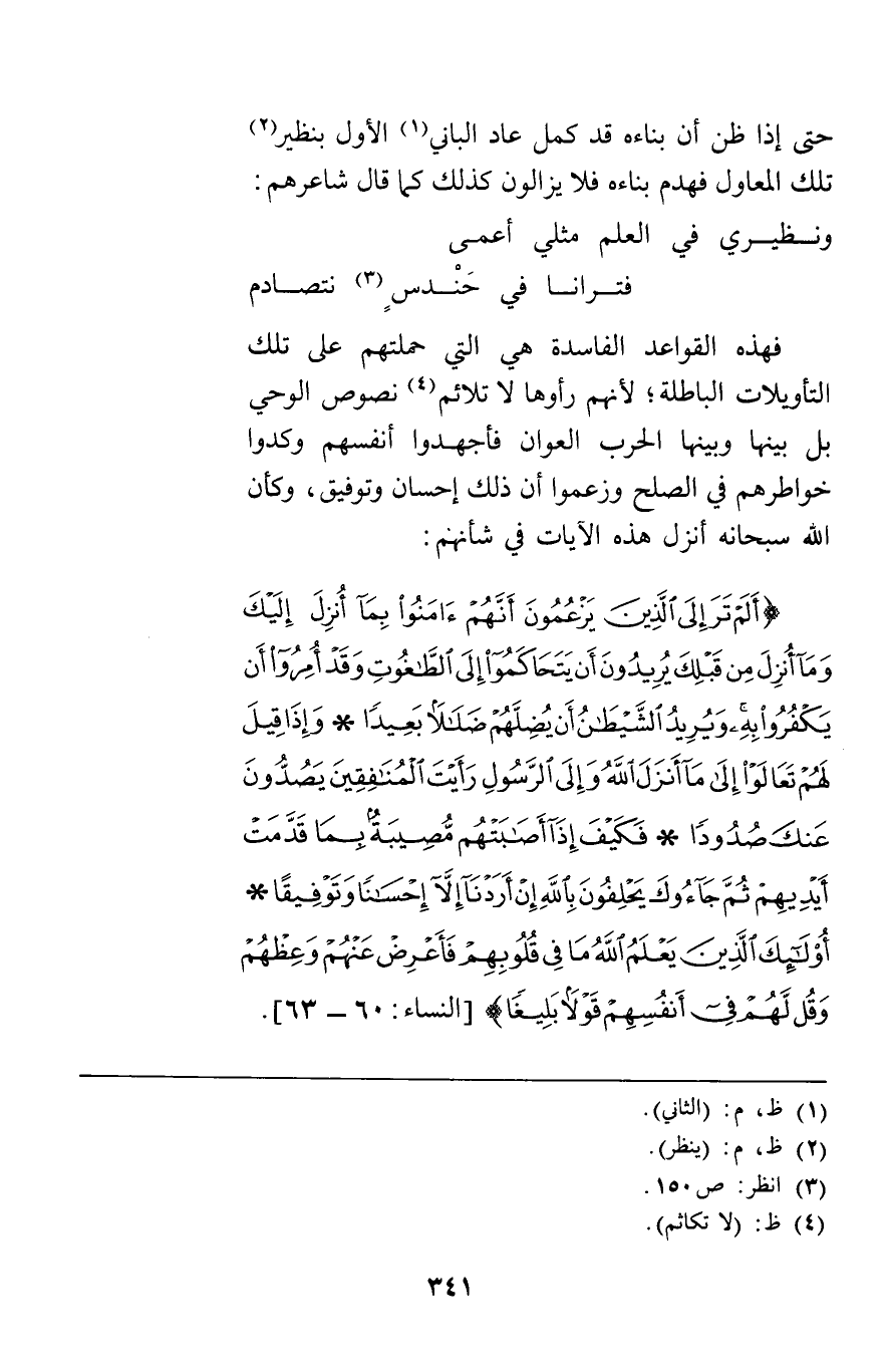 فهذه القواعد الفاسدة هي التي حملتهم على تلك التأويلات الباطلة لأنهم رأوها لا تلائم نصوص الوحي بل بينها وبينها الحرب العوان فأجهدوا أنفسهم وكدوا خواطرهم في الصلح وزعموا أن ذلك إحسان وتوفيق وكأن الله سبحانه أنزل هذه الآيات في شأنهم {أَلَمْ تَرَ إِلَى الَّذِينَ يَزْعُمُونَ أَنَّهُمْ آمَنُوا بِمَا أُنْزِلَ إِلَيْكَ وَمَا أُنْزِلَ مِنْ قَبْلِكَ يُرِيدُونَ أَنْ يَتَحَاكَمُوا إِلَى الطَّاغُوتِ وَقَدْ أُمِرُوا أَنْ يَكْفُرُوا بِهِ وَيُرِيدُ الشَّيْطَانُ أَنْ يُضِلَّهُمْ ضَلالاً بَعِيداً وَإِذَا قِيلَ لَهُمْ تَعَالَوْا إِلَى مَا أَنْزَلَ اللَّهُ وَإِلَى الرَّسُولِ رَأَيْتَ الْمُنَافِقِينَ يَصُدُّونَ عَنْكَ صُدُوداً فَكَيْفَ إِذَا أَصَابَتْهُمْ مُصِيبَةٌ بِمَا قَدَّمَتْ أَيْدِيهِمْ ثُمَّ جَاءُوكَ يَحْلِفُونَ بِاللَّهِ إِنْ أَرَدْنَا إِلاَّ إِحْسَاناً وَتَوْفِيقاً أُولَئِكَ الَّذِينَ يَعْلَمُ اللَّهُ مَا فِي قُلُوبِهِمْ فَأَعْرِضْ عَنْهُمْ وَعِظْهُمْ وَقُلْ لَهُمْ فِي أَنْفُسِهِمْ قَوْلاً بَلِيغاً} [النساء63-60]