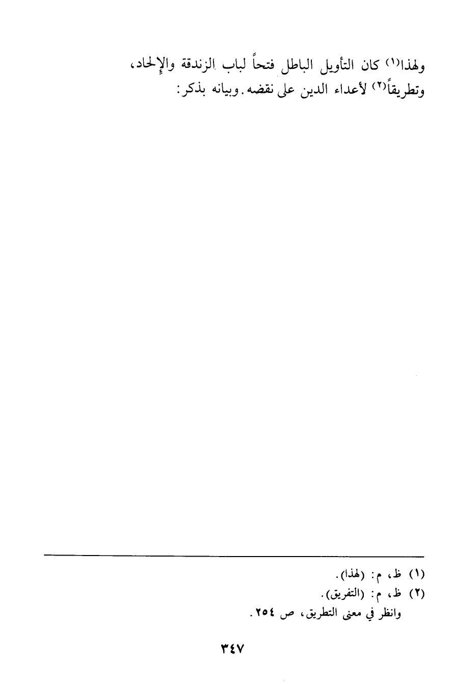 ولهذا كان التأويل الباطل فتحا لباب الزندقة والإلحاد وتطريقا لأعداء الدين على نقضه وبيانه بذكر.