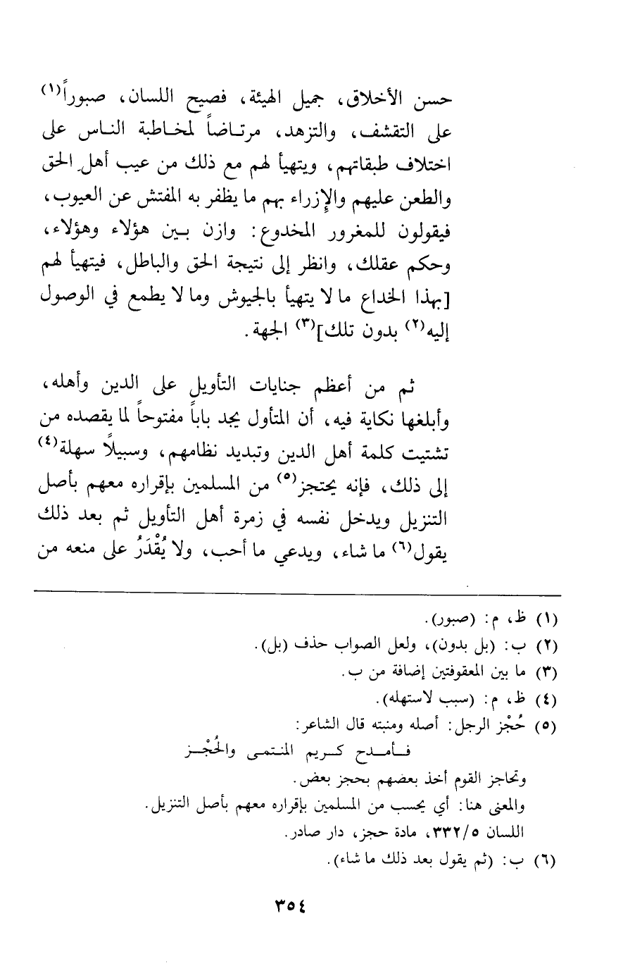 ثم من أعظم جنايات التأويل على الدين وأهله وأبلغها نكاية فيه أن المتأول يجد بابا مفتوحا لما يقصده من تشتيت كلمة أهل الدين وتبديد نظامهم وسبيلا سهلة إلى ذلك فإنه يحتجز من المسلمين بإقراره معهم بأصل التنزيل ويدخل نفسه في زمرة أهل التأويل ثم بعد ذلك يقول ما شاء ويدعي ما أحب ولا يقدر على منعه من