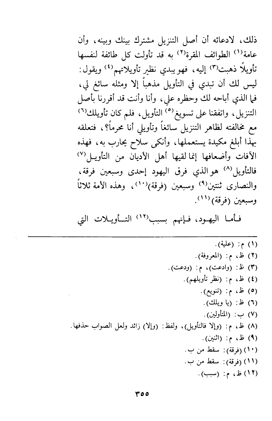 ذلك لادعائه أن أصل التنزيل مشترك بينك وبينه وأن عامة الطوائف المقرة به قد تأولت كل طائفة لنفسها تأويلا ذهبت إليه فهو يبدي نظير تأويلاتهم ويقول ليس لك أن تبدي في التأويل مذهبا إلا ومثله سائغ لي فما الذي أباحه لك وحظره علي وأنا وأنت قد أقررنا بأصل التنزيل واتفقنا على تسويغ التأويل فلم كان تأويلك مع مخالفته لظاهر التنزيل سائغا وتأويلي أنا محرما فتعلقه بهذا أبلغ مكيدة يستعملها وأنكى سلاح يحارب به فهذه الآفات وأضعافها إنما لقيها أهل الأديان من التأويل فالتأويل هو الذي فرق اليهود إحدى وسبعين فرقة والنصارى ثنتين وسبعين فرقة وهذه الأمة ثلاثا وسبعين فرقة.