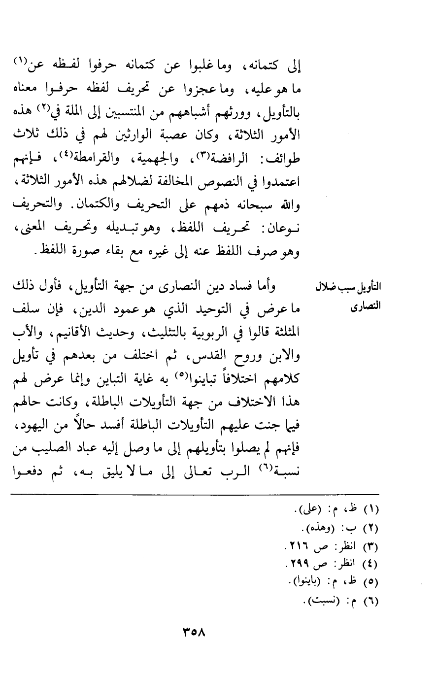 وأما فساد دين النصارى من جهة التأويل فأول ذلك ما عرض في التوحيد الذي هو عمود الدين فإن سلف المثلثة قالوا في الربوبية بالتثليث وحديث الأقانيم والأب والابن وروح القدس ثم اختلف من بعدهم في تأويل كلامهم اختلافا تباينوا به غاية التباين وإنما عرض لهم هذا الاختلاف من جهة التأويلات الباطلة وكانت حالهم فيما جنت عليهم التأويلات الباطلة أفسد حالا من اليهود فإنهم لم يصلوا بتأويلهم إلى ما وصل إليه عباد الصليب من نسبة الرب تعالى إلى ما لا يليق به ثم دفعوا