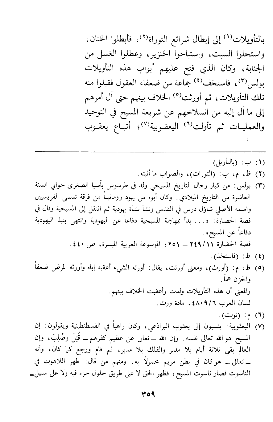 بالتأويلات إلى إبطال شرائع التوراة فأبطلوا الختان واستحلوا السبت واستباحوا الخنزير وعطلوا الغسل من الجنابة وكان الذي فتح عليهم أبواب هذه التأويلات بولس فاستخف جماعة من ضعفاء العقول فقبلوا منه تلك التأويلات ثم أورثت الخلاف بينهم حتى آل أمرهم إلى ما آل إليه من انسلاخهم عن شريعة المسيح في التوحيد والعمليات ثم تأولت اليعقوبية أتباع يعقوب