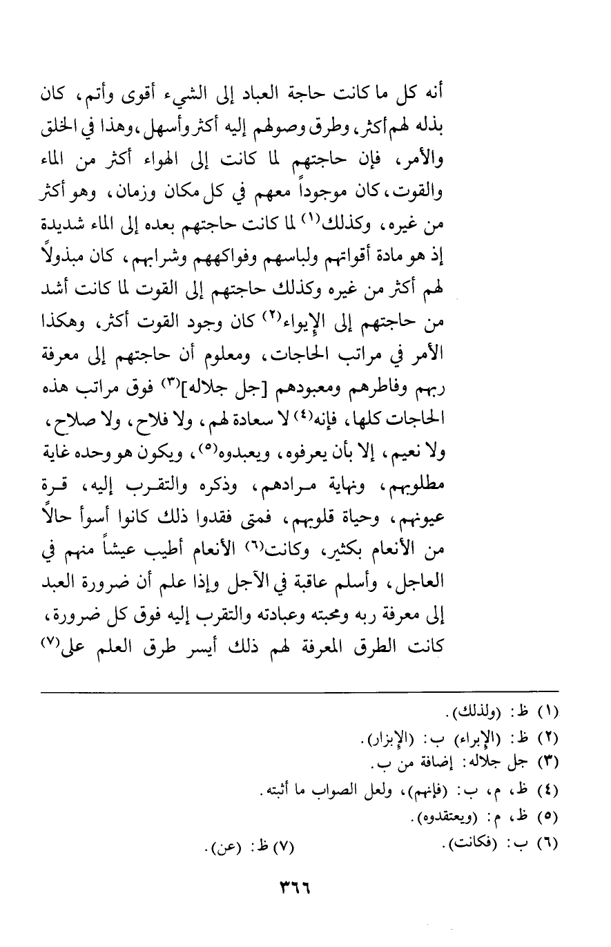 أنه كل ما كانت حاجة العباد إلى الشيء أقوى وأتم كان بذله لهم أكثر وطرق وصولهم إليه أكثر وأسهل وهذا في الخلق والأمر فإن حاجتهم لما كانت إلى الهواء أكثر من الماء والقوت كان موجودا معهم في كل مكان وزمان وهو أكثر من غيره وكذلك لما كانت حاجتهم بعده إلى الماء شديدة إذ هو مادة أقواتهم ولباسهم وفواكههم وشرابهم كان مبذولا لهم أكثر من غيره وكذلك حاجتهم إلى القوت لما كانت أشد من حاجتهم إلى الإيواء كان وجود القوت أكثر وهكذا الأمر في مراتب الحاجات ومعلوم أن حاجتهم إلى معرفة ربهم وفاطرهم ومعبودهم جل جلاله فوق مراتب هذه الحاجات كلها فإنه لا سعادة لهم ولا فلاح ولا صلاح ولا نعيم إلا بأن يعرفوه ويعبدوه ويكون هو وحده غاية مطلوبهم ونهاية مرادهم وذكره والتقرب إليه قرة عيونهم وحياة قلوبهم فمتى فقدوا ذلك كانوا أسوأ حالا من الأنعام بكثير وكانت الأنعام أطيب عيشا منهم في العاجل وأسلم عاقبة في الآجل وإذا علم أن ضرورة العبد إلى معرفة ربه ومحبته وعبادته والتقرب إليه فوق كل ضرورة كانت الطرق المعرفة لهم ذلك أيسر طرق العلم على