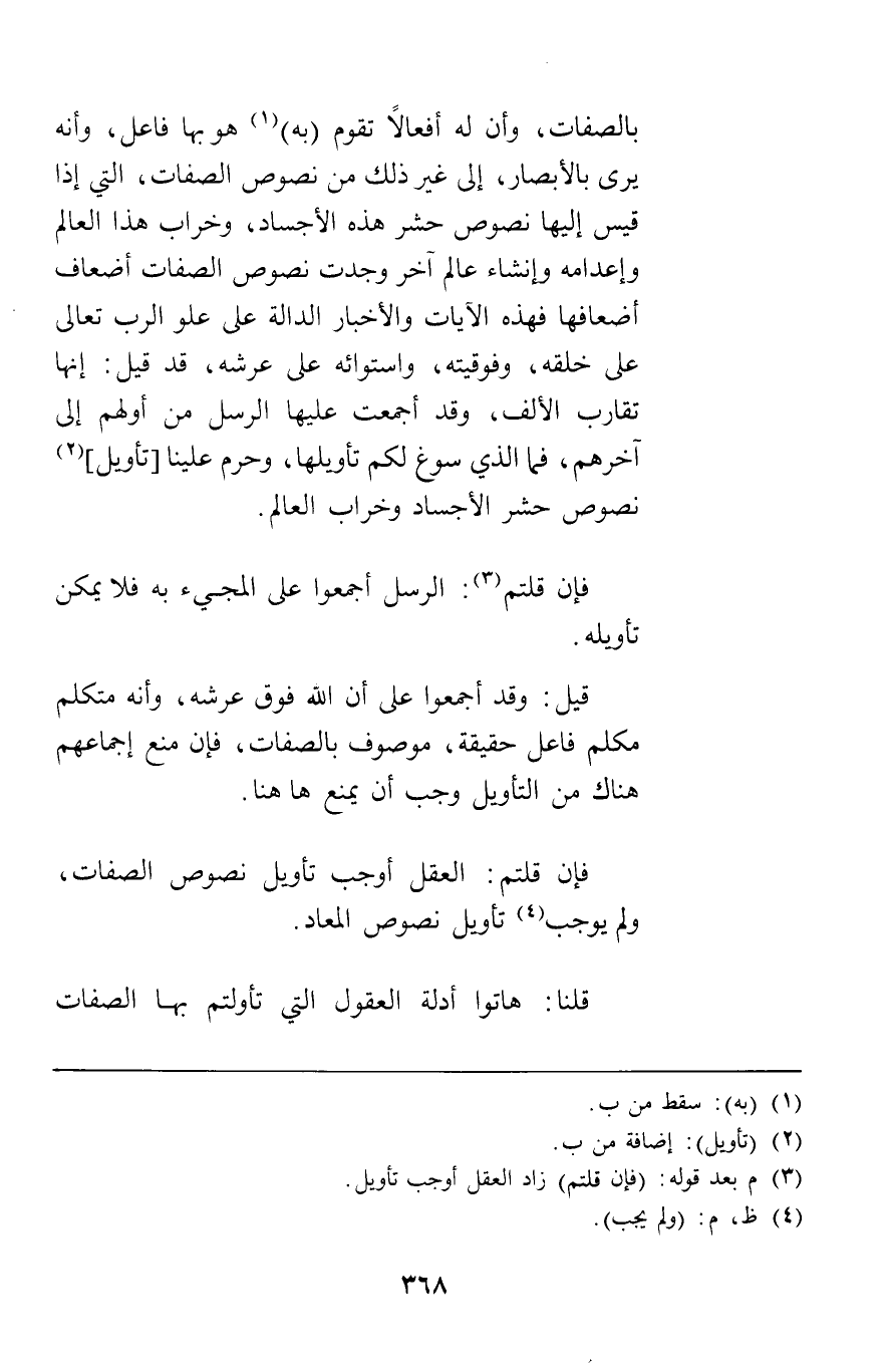 فإن قلتم: العقل أوجب تأويل نصوص الصفات ولم يوجب تأويل نصوص المعاد. قلنا: هاتوا أدلة العقول التي تأولتم بها الصفات