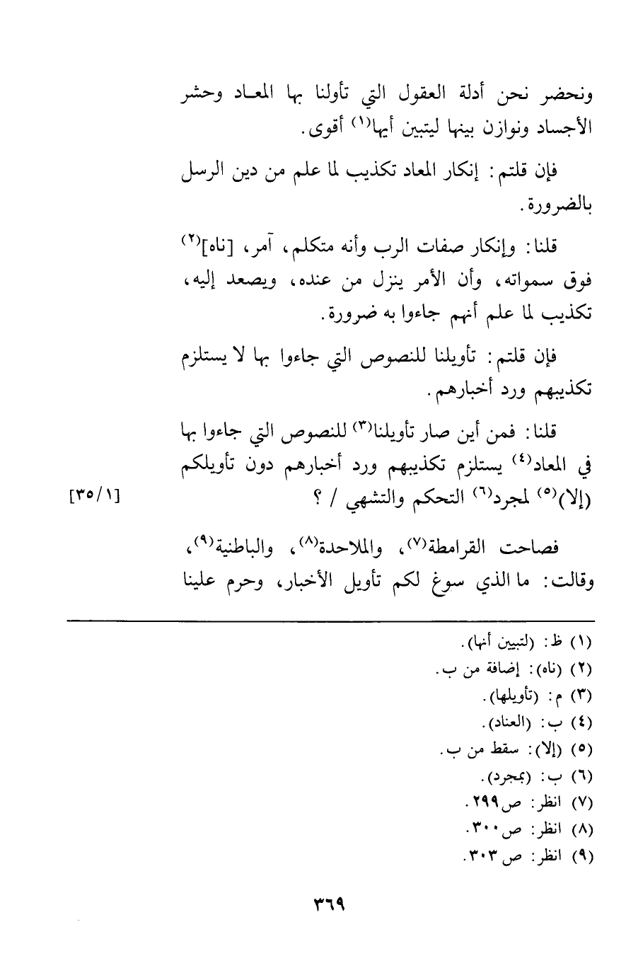 فإن قلتم: تأويلنا للنصوص التي جاءوا بها لا يستلزم تكذيبهم ورد أخبارهم. قلنا: فمن أين صار تأويلنا للنصوص التي جاءوا بها في المعاد يستلزم تكذيبهم ورد أخبارهم دون تأويلكم إلا لمجرد التحكم والتشهي.