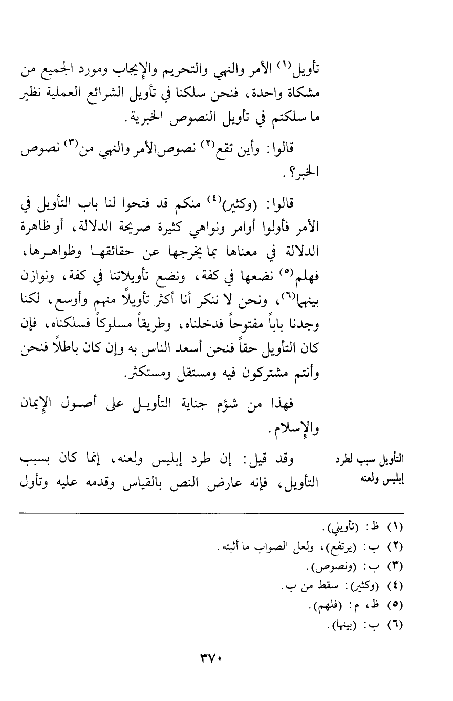 تأويل الأمر والنهي والتحريم والإيجاب ومورد الجميع من مشكاة واحدة فنحن سلكنا في تأويل الشرائع العملية نظير ما سلكتم في تأويل النصوص الخبرية?.