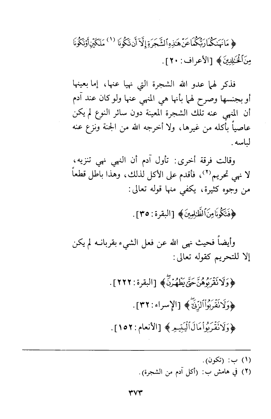 {مَا نَهَاكُمَا رَبُّكُمَا عَنْ هَذِهِ الشَّجَرَةِ إِلاَّ أَنْ تَكُونَا مَلَكَيْنِ أَوْ تَكُونَا مِنَ الْخَالِدِينَ} [الأعراف 20] فذكر لهما عدو الله الشجرة التي نهيا عنها إما بعينها أو بجنسها وصرح لهما بأنها هي المنهي عنها ولو كان عند آدم أن المنهي عنه تلك الشجرة المعينة دون سائر النوع لم يكن عاصيا بأكله من غيرها ولا أخرجه الله من الجنة ونزع عنه لباسه وقالت فرقة أخرى تأول آدم أن النهي نهي تنزيه لا نهي تحريم فأقدم على الأكل لذلك وهذا باطل قطعا من وجوه كثيرة يكفي منها قوله تعالى {فَتَكُونَا مِنَ الظَّالِمِينَ} [البقرة35] وأيضا فحيث نهى الله عن فعل الشيء بقربانه لم يكن إلا للتحريم كقوله تعالى {وَلا تَقْرَبُوهُنَّ حَتَّى يَطْهُرْنَ} [البقرة222] {وَلا تَقْرَبُوا الزِّنَى} [الإسراء32] {وَلا تَقْرَبُوا مَالَ الْيَتِيمِ} [الأنعام152]
