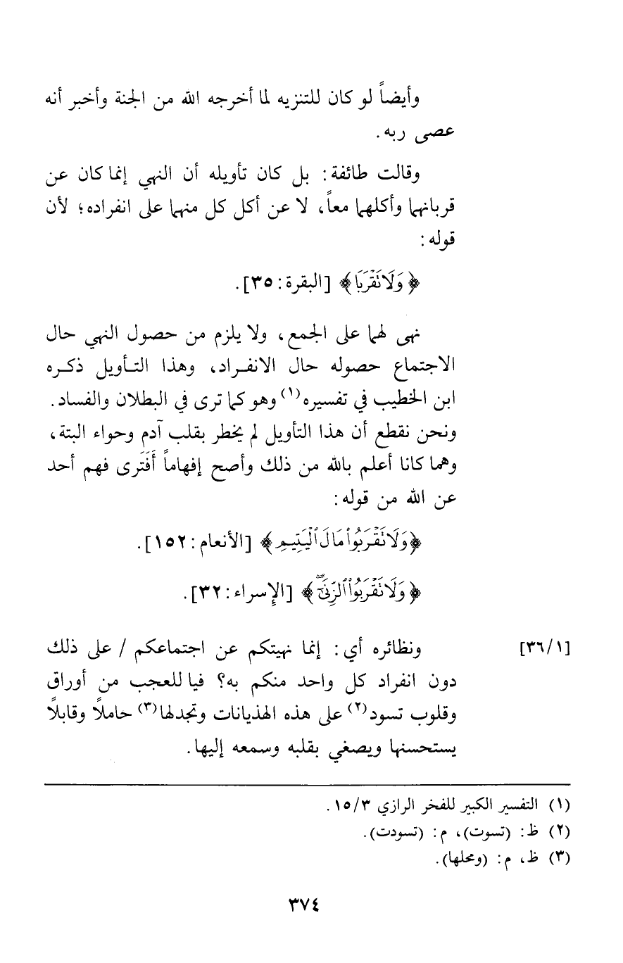 وأيضا لو كان للتنزيه لما أخرجه الله من الجنة وأخبر أنه عصى ربه وقالت طائفة: بل كان تأويله أن النهي إنما كان عن قربانهما وأكلهما معا لا عن أكل كل منهما على انفراده لأن قوله {وَلا تَقْرَبَا} [البقرة35] نهى لهما على الجمع ولا يلزم من حصول النهي حال الاجتماع حصوله حال الانفراد وهذا التأويل ذكره ابن الخطيب في تفسيره وهو كما ترى في البطلان والفساد ونحن نقطع أن هذا التأويل لم يخطر بقلب آدم وحواء البته وهما كانا أعلم بالله من ذلك وأصح إفهاما أفترى فهم أحد عن الله من قوله {وَلا تَقْرَبُوا مَالَ الْيَتِيمِ} [الأنعام152] {وَلا تَقْرَبُوا الزِّنَى} [الإسراء32] ونظائره أي إنما نهيتكم عن اجتماعكم على ذلك دون انفراد كل واحد منكم به فيا للعجب من أوراق وقلوب تسود على هذه الهذيانات وتجد لها حاملا وقابلا يستحسنها ويصغي بقلبه وسمعه إليها