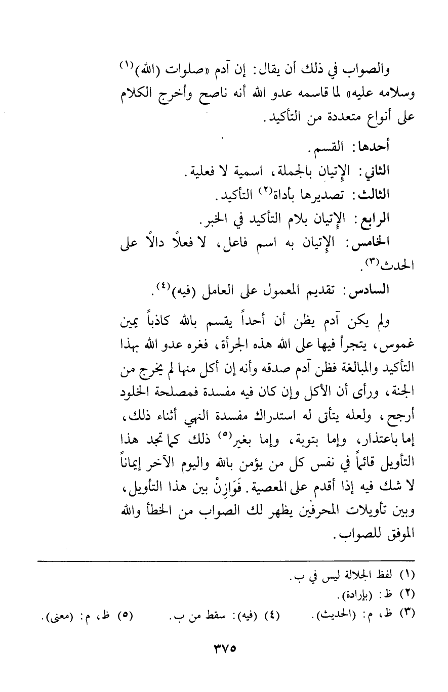 ولم يكن آدم يظن أن أحدا يقسم بالله كاذبا يمين غموس يتجرأ فيها على الله هذه الجرأة فغره عدو الله بهذا التأكيد والمبالغة فظن آدم صدقه وأنه إن أكل منها لم يخرج من الجنة ورأى أن الأكل وإن كان فيه مفسدة فمصلحة الخلود أرجح ولعله يتأتى له استدراك مفسدة النهي أثناء ذلك إما باعتذار وإما بتوبة وإما بغير ذلك كما تجد هذا التأويل قائما في نفس كل من يؤمن بالله واليوم الآخر إيمانا لا شك فيه إذا اقدم على المعصية فوازن بين هذا التأويل وبين تأويلات المحرفين يظهر لك الصواب من الخطأ والله الموفق للصواب