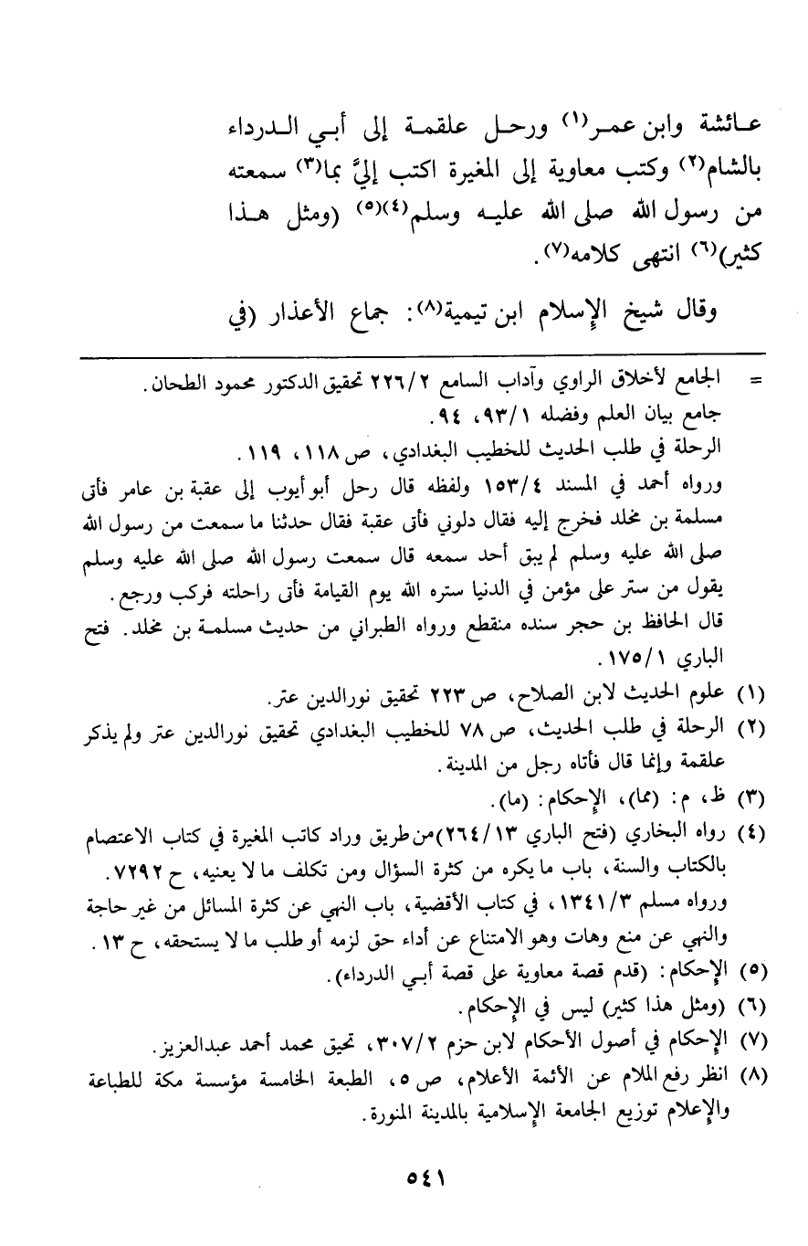 عائشة وابن عمر ورحل علقمة إلى أبي الدرداء بالشام وكتب معاوية إلى المغيرة اكتب إلي بما سمعته من رسول الله صلى الله عليه وسلم ومثل هذا كثير انتهى كلامه.