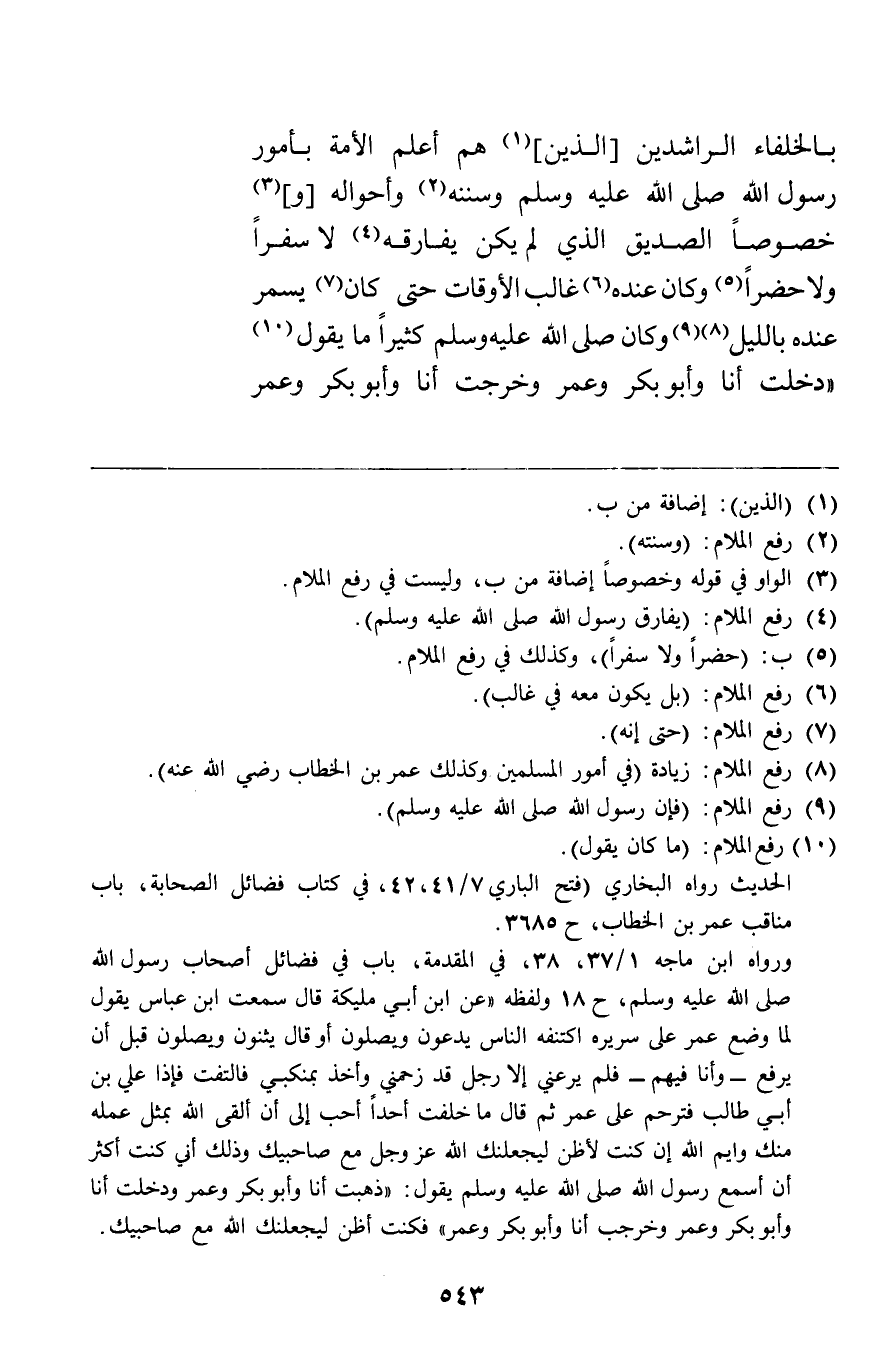 بالخلفاء الراشدين الذين هم أعلم الأمة بأمور رسول الله صلى الله عليه وسلم وسننه وأحواله وخصوصا الصديق الذي لم يكن يفارقه لا سفرا ولا حضرا وكان عنده غالب الأوقات حتى كان يسمر عنده بالليل وكان كثيرا ما يقول: "دخلت أنا وأبو بكر وعمر وخرجت أنا وأبو بكر وعمر"