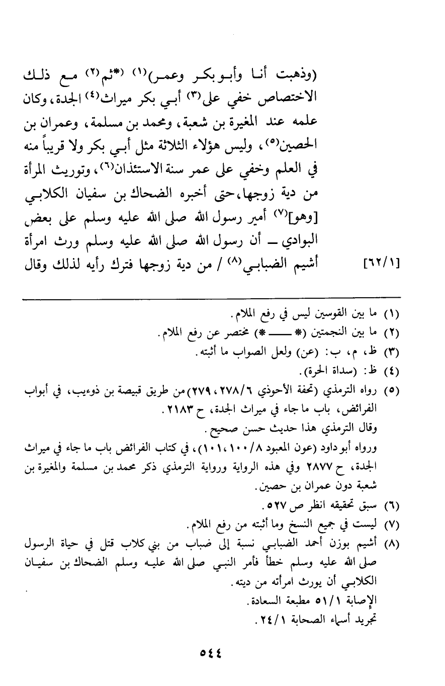 "وذهبت أنا وأبو بكر وعمر" ثم مع ذلك الاختصاص خفي على أبي بكر ميراث الجدة وكان علمه عند المغيرة بن شعبة ومحمد بن مسلمة وعمران بن الحصين وليس هؤلاء الثلاثة مثل أبي بكر ولا قريبا منه في العلم وخفي على عمر سنة الاستئذان وتوريث المرأة من دية زوجها حتى أخبره الضحاك بن سفيان الكلابي وهو أمير رسول الله صلى الله عليه وسلم على بعض البوادي أن رسول الله صلى الله عليه وسلم ورث امرأة أشيم الضبابي من دية زوجها فترك رأيه لذلك وقال